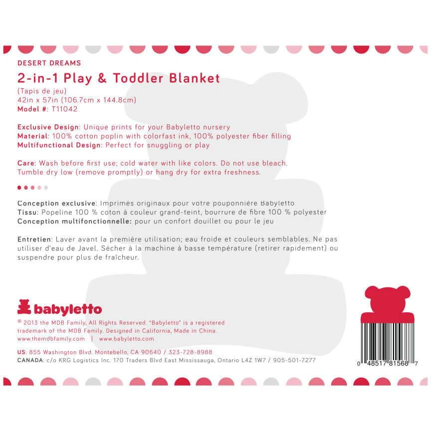 Designed for tummy time and active play, the reversible Desert Dreams 2-in-1 Toddler Play Blanket is perfect for cuddling up. Finished with contrast piping, both sides feature festive and playful geometric patterns. When baby grows into a toddler, the blanket is perfectly sized to be a toddler comforter.