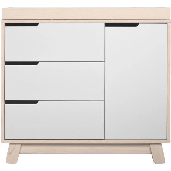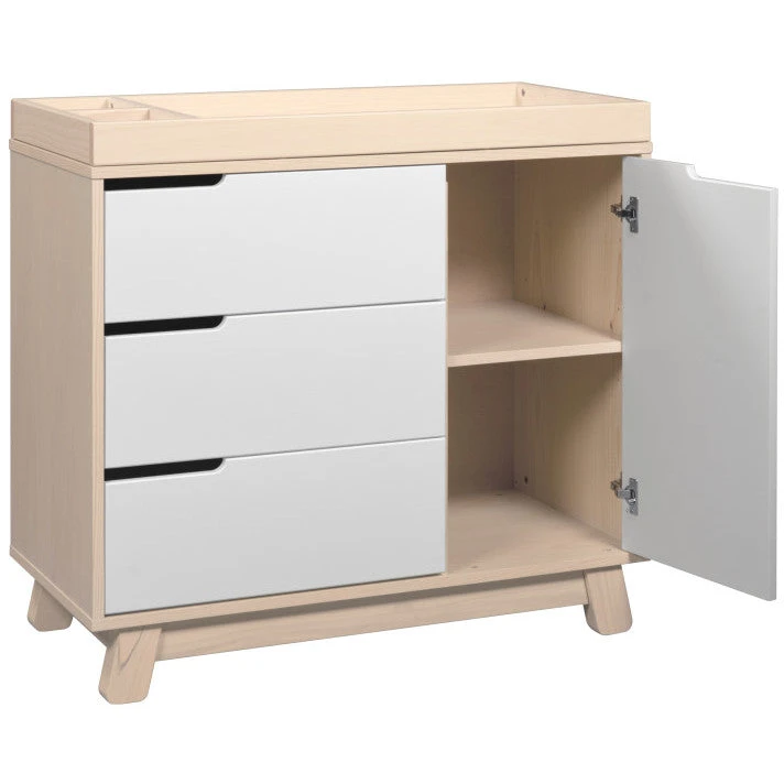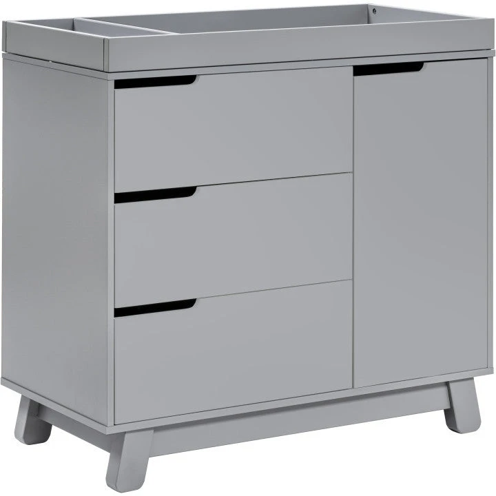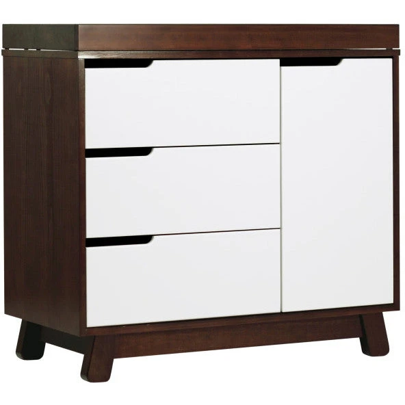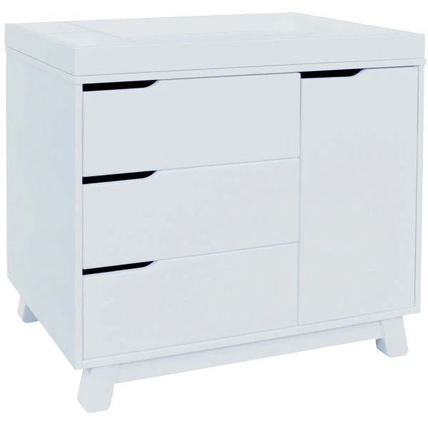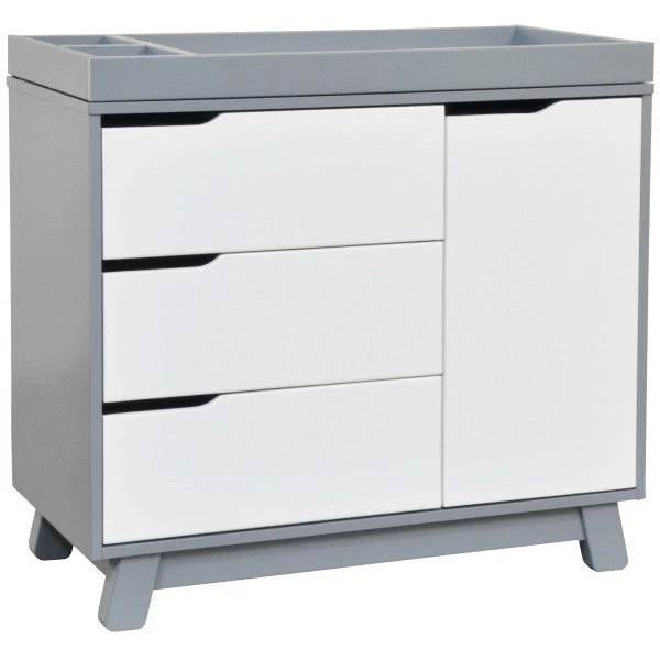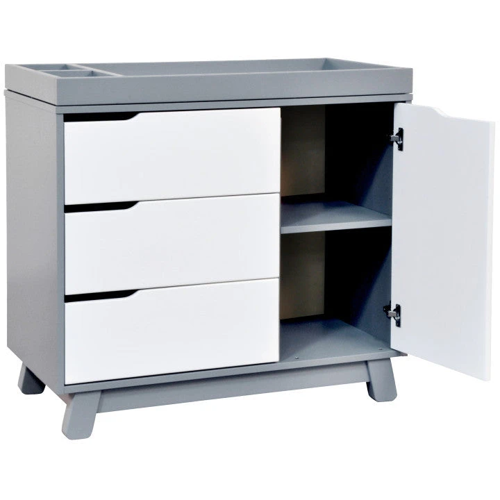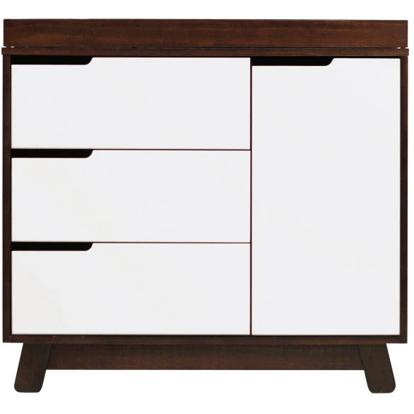 Get more from your nursery furniture with the versatile Hudson Changer Dresser. Combining a changing table, three drawer dresser, and storage cabinet all in one solid and practical package, the Hudson Changer Dresser is a modern space-saving convenience. Complementing the mid-century modern-inspired Hudson 3-in-1 Convertible Crib, the dresser comes in three chic finishes including two new takes on two-tone for the nursery. Truly built for baby, the removable changer tray’s raised sides help keep your little one safe, and an anti-tip kit is included for further security. Keep baby’s clothes and necessities organized in the smooth-opening drawers, while stop mechanisms prevent them from being pulled all of the way out. The storage cabinet closes gently and includes an adjustable shelf, perfect for keeping diapers and wipes handy.