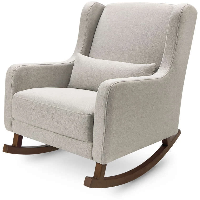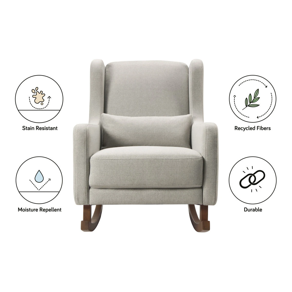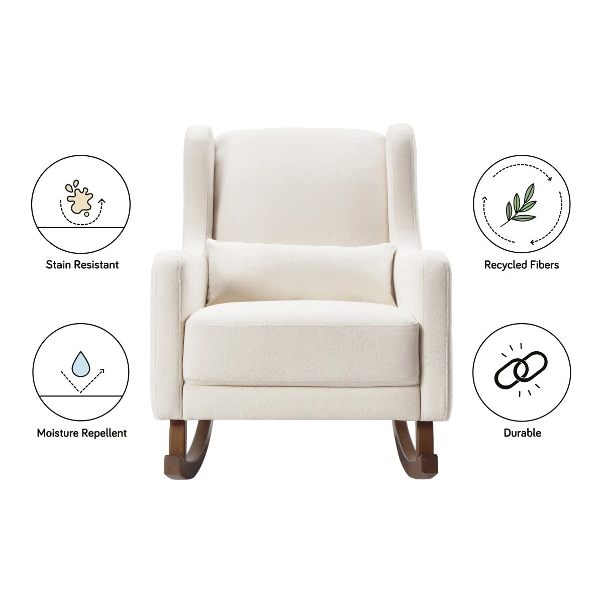 Take a moment to relax in the charming mid-century styled Kai rocking chair. Designed with modern rounded edges, curved walnut stained rubberwood legs, and included lumbar cushion for added comfort. It’s a stylish but also more sustainable choice for the modern nursery. Upholstered by hand in our eco-performance fabric, that is stain resistant, water repellent, and made with at least 30% recycled fibers.
