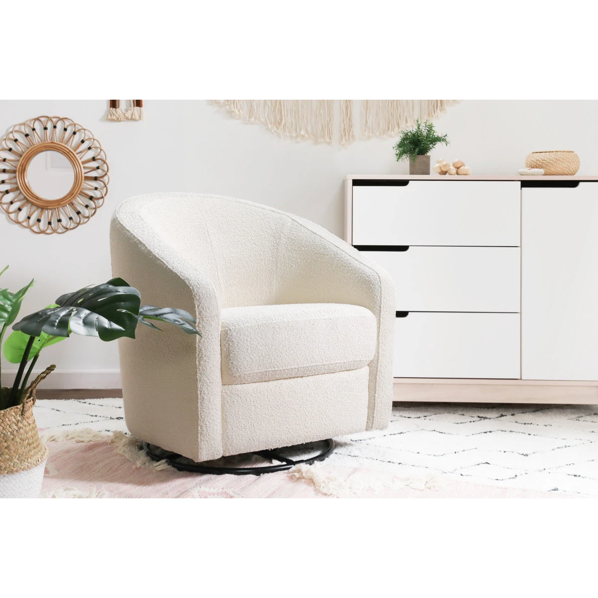 Snuggle in and rock baby to sweet slumber with the sublime comfort of the Madison Swivel Glider. This soft and cozy glider’s rounded back and spacious seat make for heavenly cuddling and story time. The Madison Glider’s metal swivel mechanism base allows you to turn and glide a full 360°; easily turn to talk with your family while staying put with baby. Upholstered by hand in ultra-soft water-repellant and stain-resistant microsuede, the classic mid-century curves of the Madison Swivel Glider will add beautiful comfort during the nursery years and beyond.