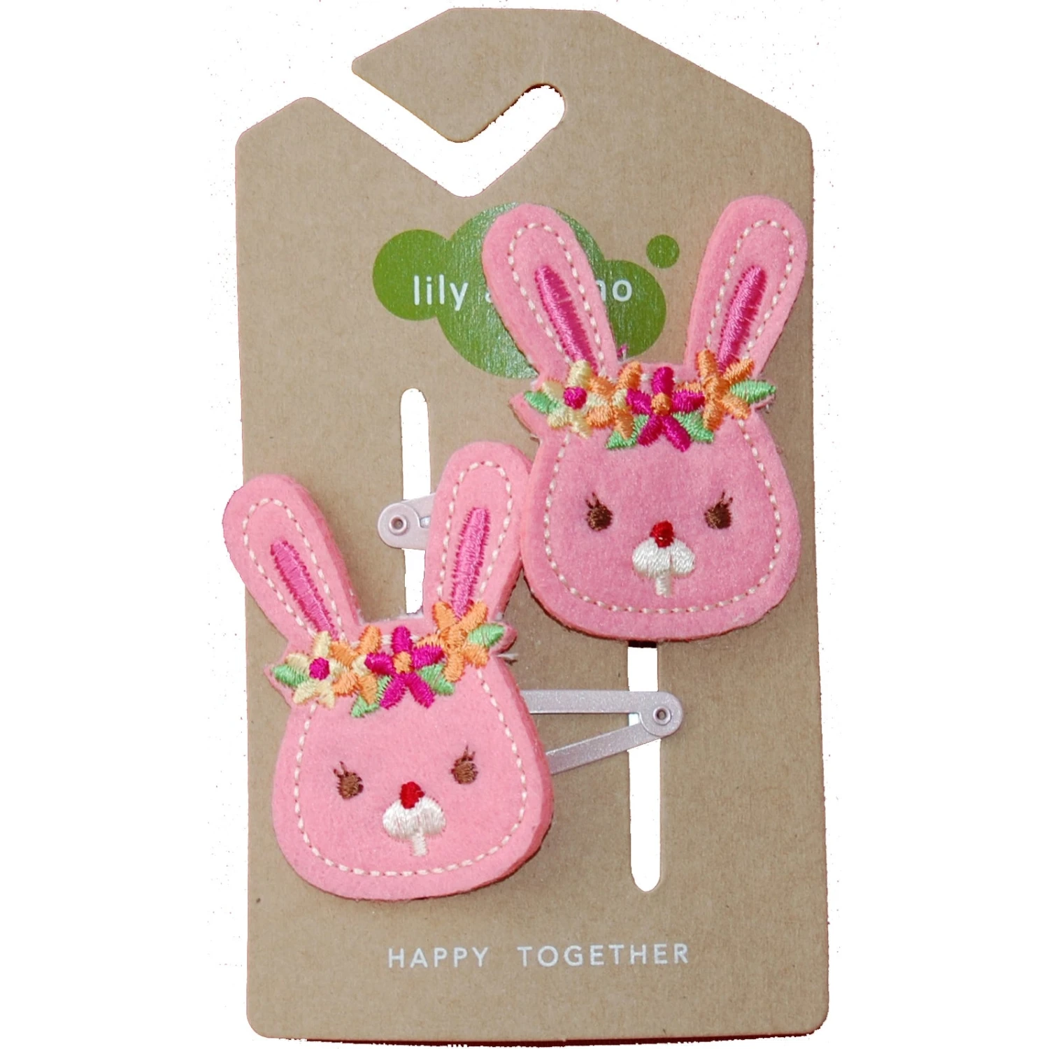 Sweet pair of pink bunny hair clips with flower details. -Clips will be on our white display cards and not the card shown in this picture. -Handmade -Snap clips -Imported