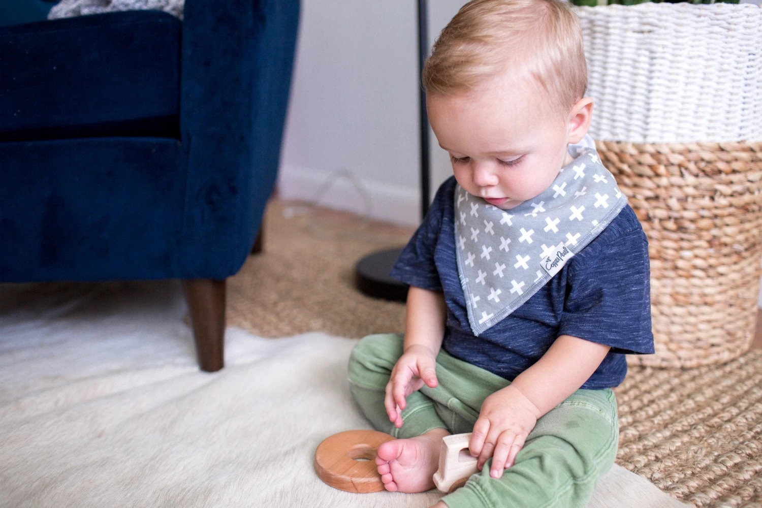 These stylish drool bibs are made of 100% absorbent cotton on the front and 100% polyester fleece on the back. The front of the baby bib is a stylish knit fabric and the back is a super soft fleece that keeps your baby completely dry even with the drooliest of babies. Great for teething babies!