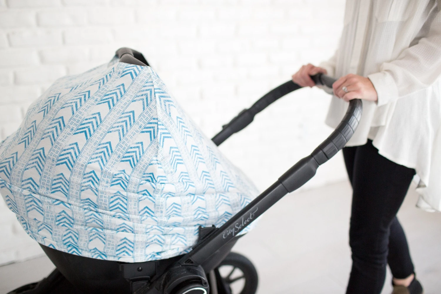 - Stretchy fabric fits most all car seats, shopping carts, high chairs and nursing mothers. It can also be a trendy infinity scarf! The modern blue and white fabric is gender neutral and trendy