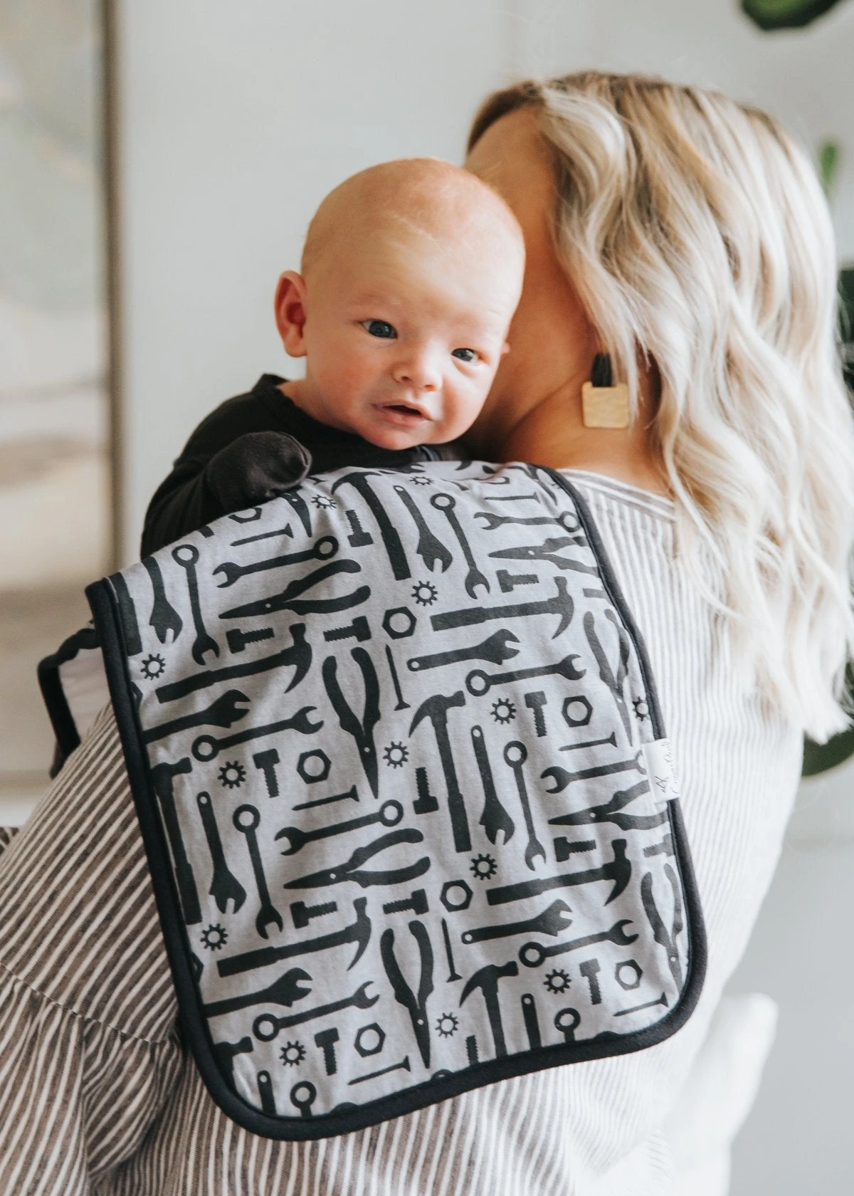 Our burp cloths are designed with baby’s comfort in mind. That’s why we created them with 100% ultra-soft cotton layers on the front (patterned) and back (plain white). You can feel confident that baby will feel cozy against your shoulder while burping.