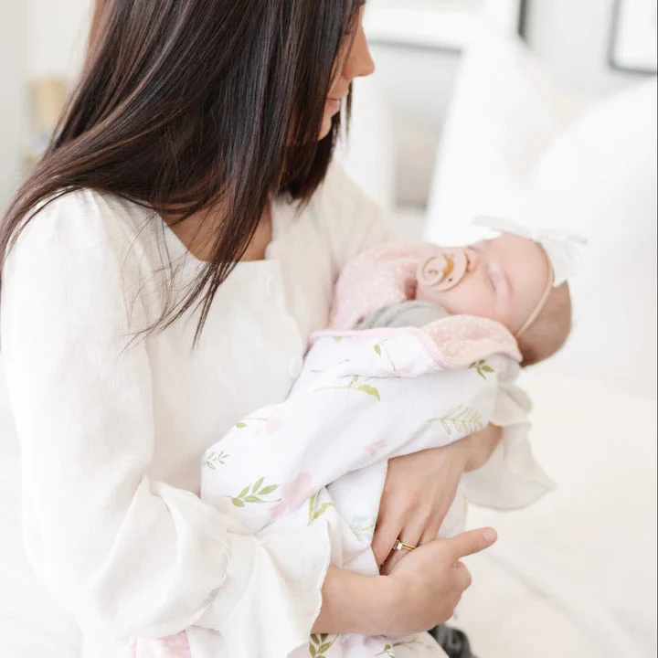 If you love our muslin quilts, then you are sure to love our new 4-layer Olive Branch muslin/cotton quilt. A durable, yet soft boutique-quality fabric combination that is created to last. This reversible blanket features a soft green color detailed with a simple leaf pattern on one side and a simple, free-flowing green and white stripe on the other. These complimentary patterns have two additional muslin/cotton layers between them making them thicker, warmer and more structured yet still airy, breathable and Saranoni soft. We like to consider this the perfect next step when your baby has outgrown their Olive Branch swaddle set; giving you both patterns in one blanket. The 47″ x 47″ size will provide your little one plenty of coverage as they grow from toddler to childhood.