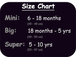 | Size | Mini (6-18m), Big (18m-5yrs), Super (5-10yrs) |