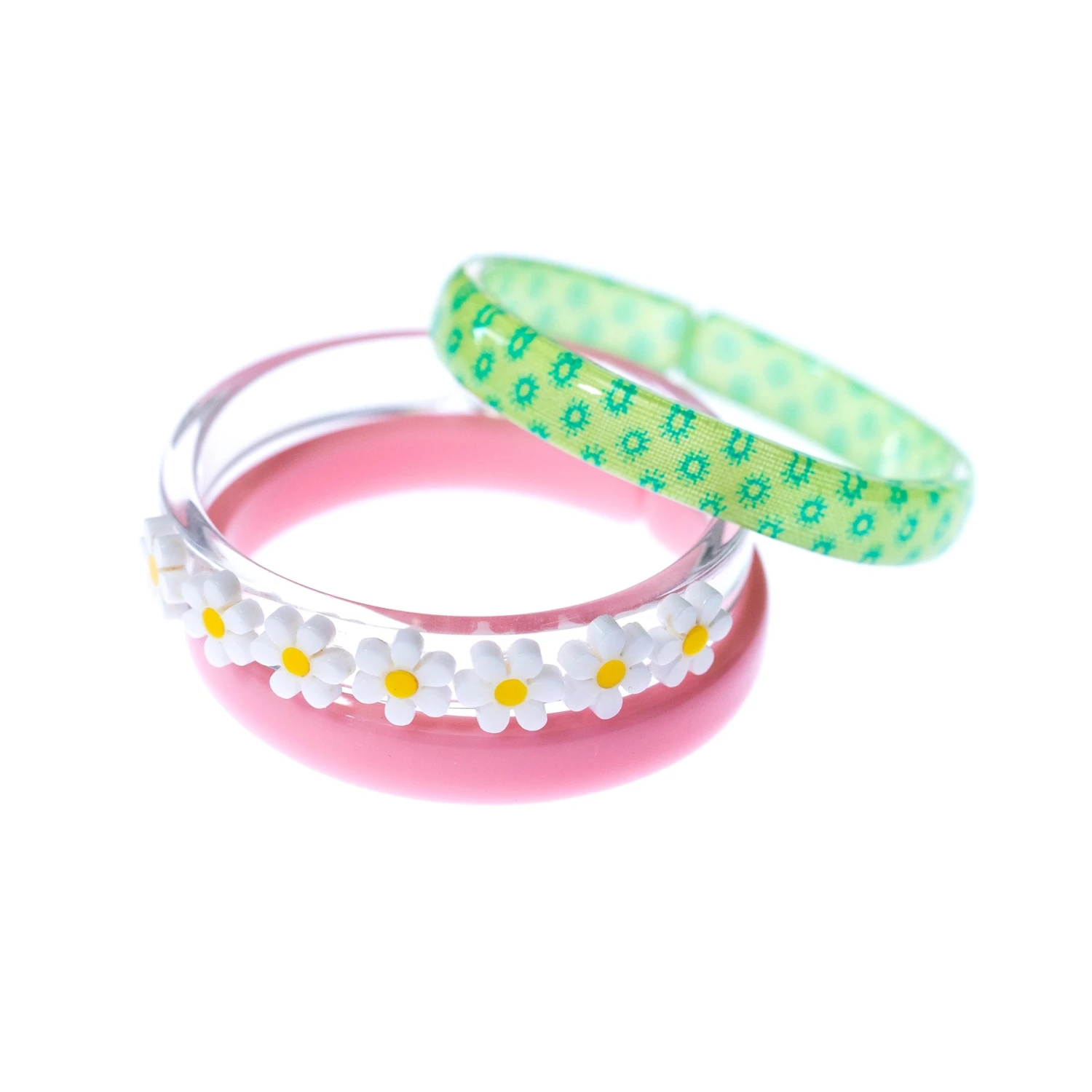 Shine all day! These colorful, lucite bangles made of acrylic are one of our bestsellers. These three happy colors – one pink, one clear with white flower accents, and a green print – can be worn together or separately for a pretty spring combination. Each of our bracelets has an opening to put wrist in. -Set of 3 – Ages: 3-6 years