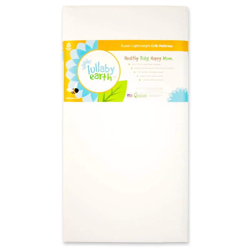 Designed to be easy for mom and safe for baby, the Lullaby Earth Super Lightweight Crib Mattress delivers the perfect balance of features. Weighing a mere 7 lbs, it’s a breeze to change the sheets. It also features a waterproof design (even on the edges where most crib mattresses have seams), a firm and durable construction, square corners for a snug fit, and of course, no harmful chemicals or allergens. Meets the strictest GREENGUARD® certification standards for eliminating chemical emissions. Measures 27.5″ x 52″ x 6″ and comes with a lifetime limited warranty. Proudly made in the U.S.A.