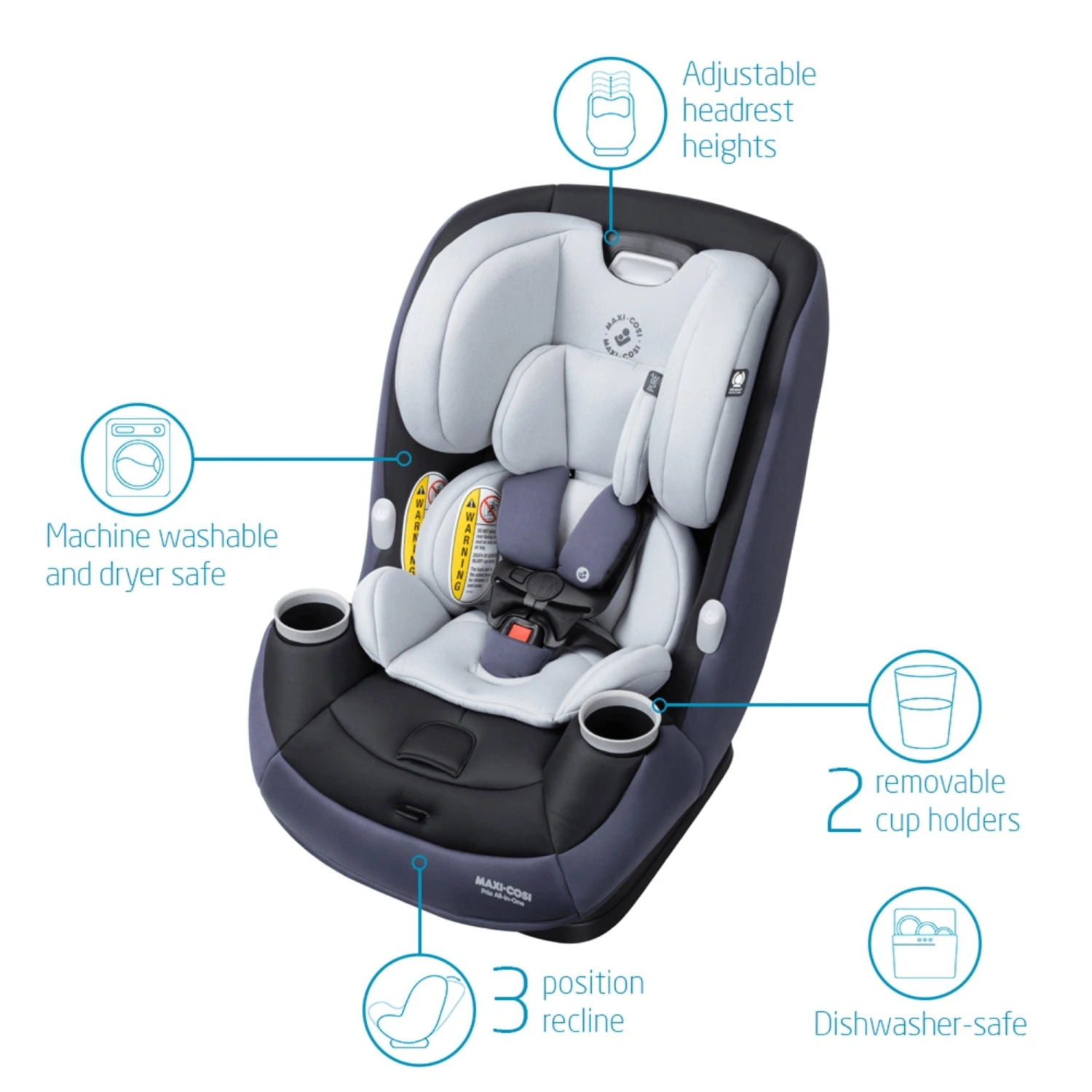 Keep your little one snug and secure from the very first ride home with the Pria All-in-One Convertible Car Seat. Made to keep up with your growing family: rear-facing (4–40 lbs. and 19″–40″), forward-facing (22–65 lbs. and 29″–49″), and belt-positioning booster (40–100 lbs. and 43″–52″). Pria is designed for your child’s comfort but includes conveniences for you as well. Raise the integrated QuikFit headrest and harness system with 1 hand to properly fit your child when they seem to grow overnight. In-and-out harness holders keep straps out of the way when buckling or unbuckling your squirmy one, making it easier and quicker to get on your way. ReclineFit provides 3 reclining positions for a relaxing ride, plus an easier fit in your car. The infant pillow and cushions provide extra support and can be easily removed without re-threading the harness. Select color options feature PureCosi fabrics and padding made without wool or added fire retardant treatment. Plus, all fabrics are machine-washable and-dryer safe. This all-in-one car seat is ready to journey through the years ahead as you create memories with your little one. Rear-facing (4–40 lbs. and 19″–40″), forward-facing (22–65 lbs. and 29″–49″), and belt-positioning booster (40–100 lbs. and 43″–52″).