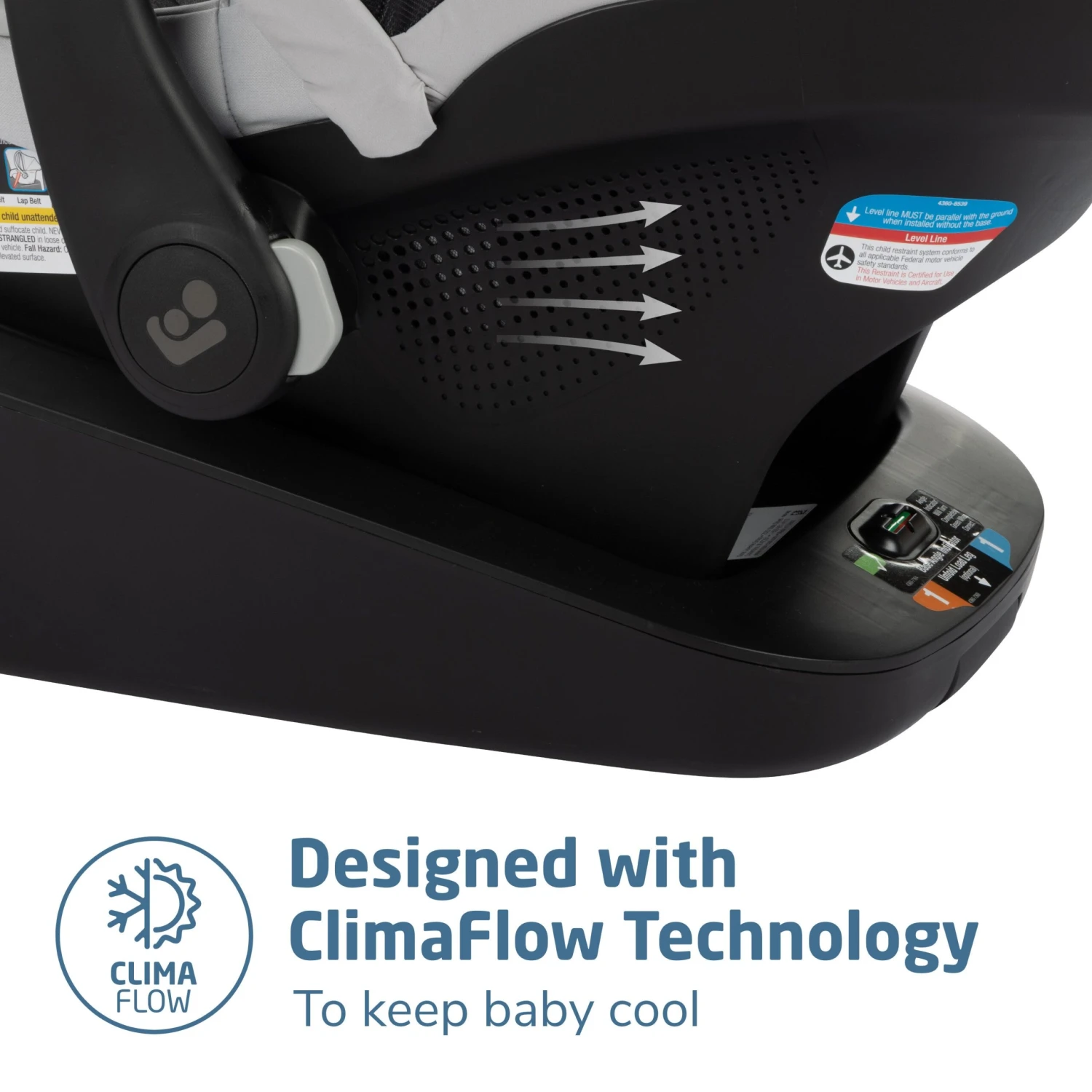 - Infant car seat shell designed with ClimaFlow™ technology, providing added ventilation to help keep baby cooler