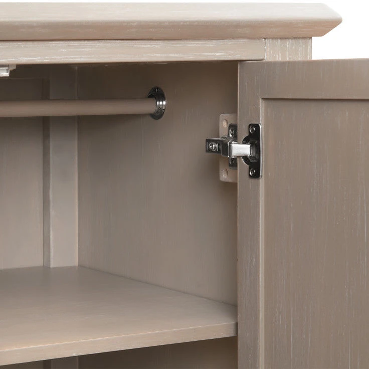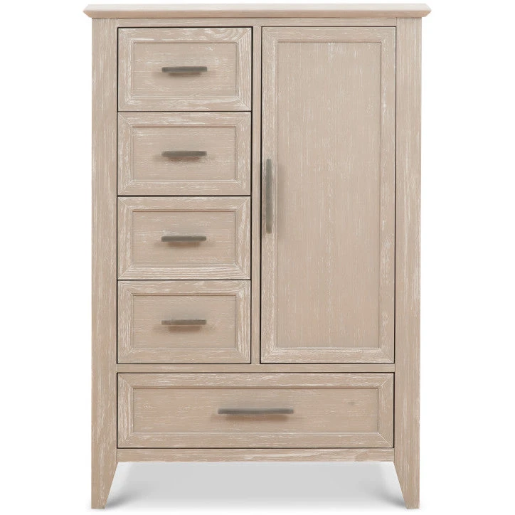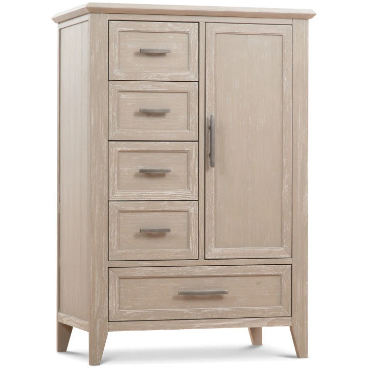 The Beckett Chifforobe bridges the gap between traditional and modern design with its texturized wood finish, clean silhouette and thoughtful detailing. Featuring drawers and cabinet space, simple tapered feet, and mitered cuts with contemporary 45 degree trimming, the Beckett Chifforobe is a transitional piece that will grow with your family.