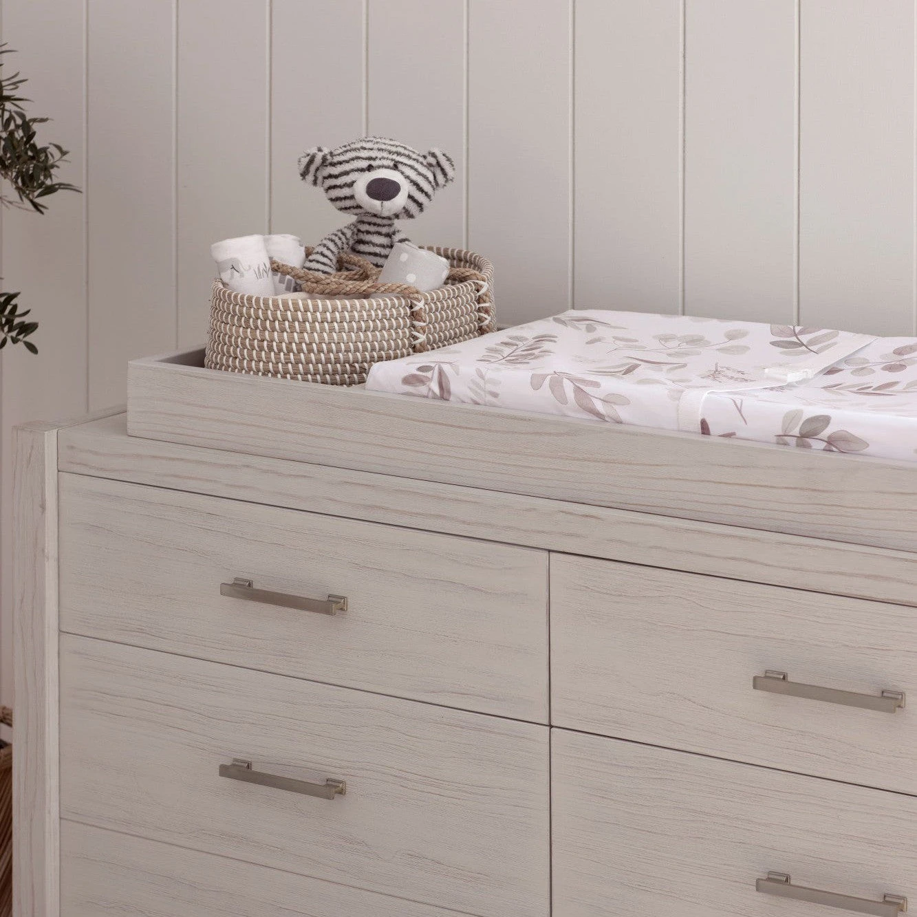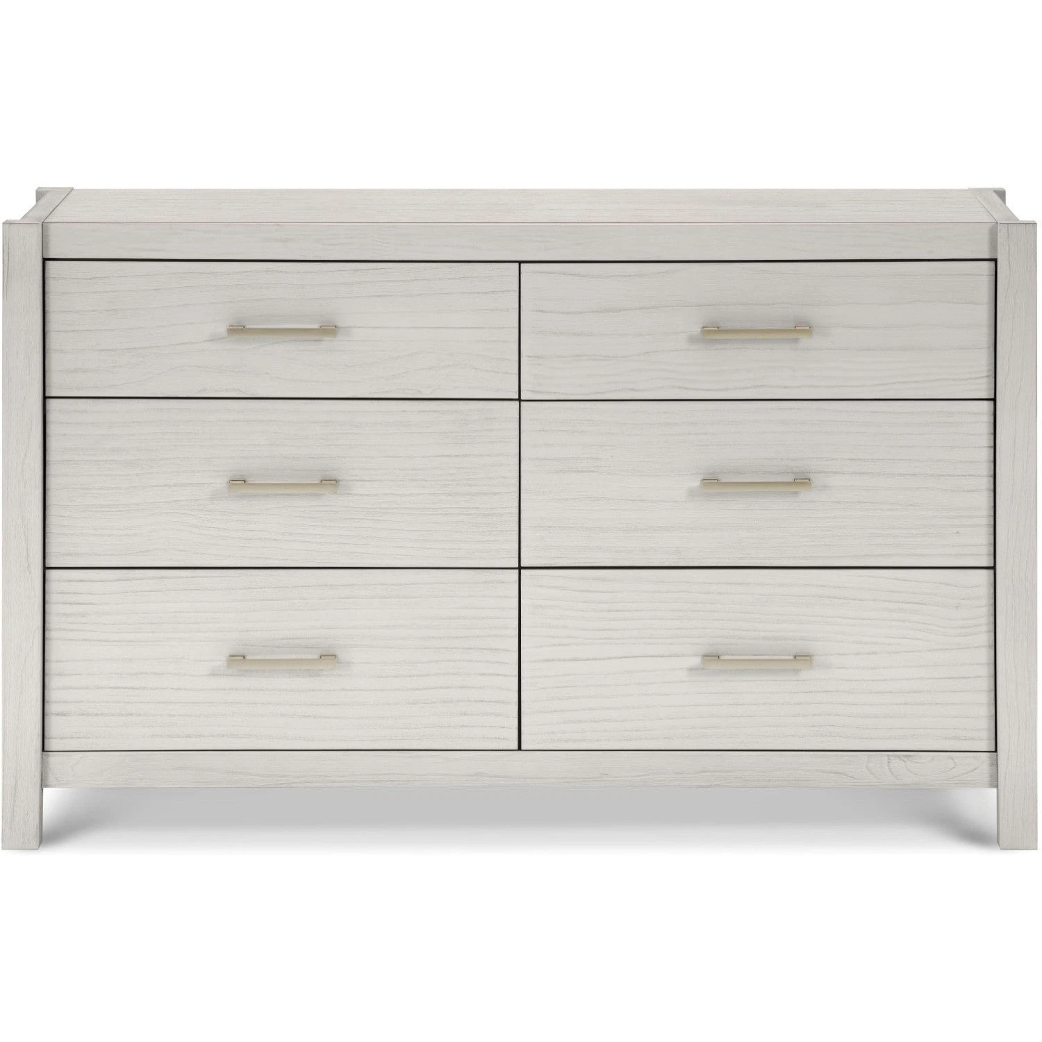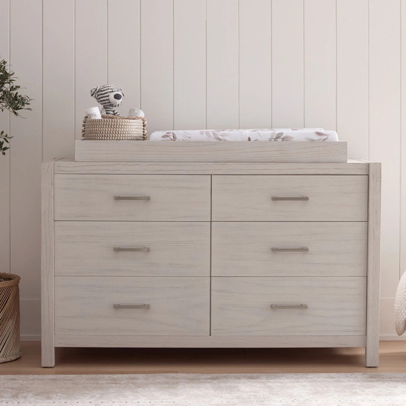 Complete your modern farmhouse nursery with the Hemsted 6-Drawer Dresser, featuring a premium texturized wood finish and elegant gold hardware that enhances the dresser’s contemporary flair. Soft-closing, ball-bearing drawer glides make this dresser easy to use.