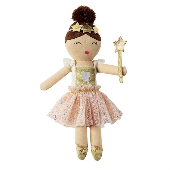 Plush linen tooth fairy doll features sweater knit hair with metallic faux leather crown, embroidered facial features, mesh tutu, metallic faux leather wand and woven gold lurex details.
