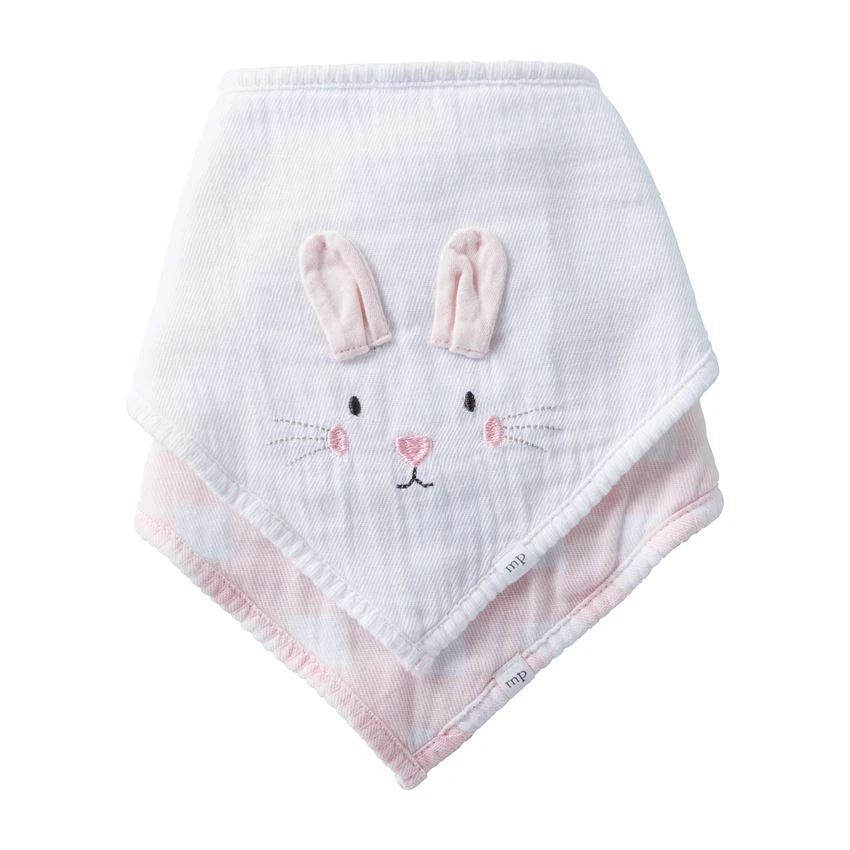 Set of two twill muslin bandana style bibs with long pile minky backing. Bunny bib features dimensional ears.
