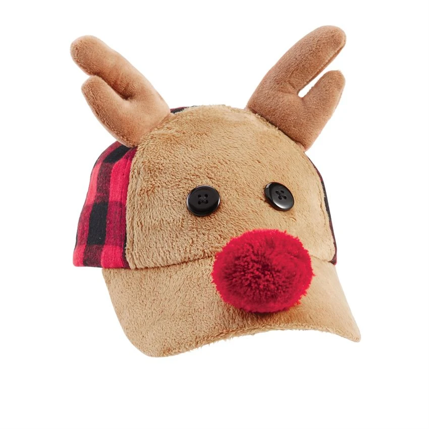 Buffalo check flannel baseball-style hat features long pile minky reindeer bill with wood summary eyes, yarn pom-pom nose and dimensional plush velour antlers.