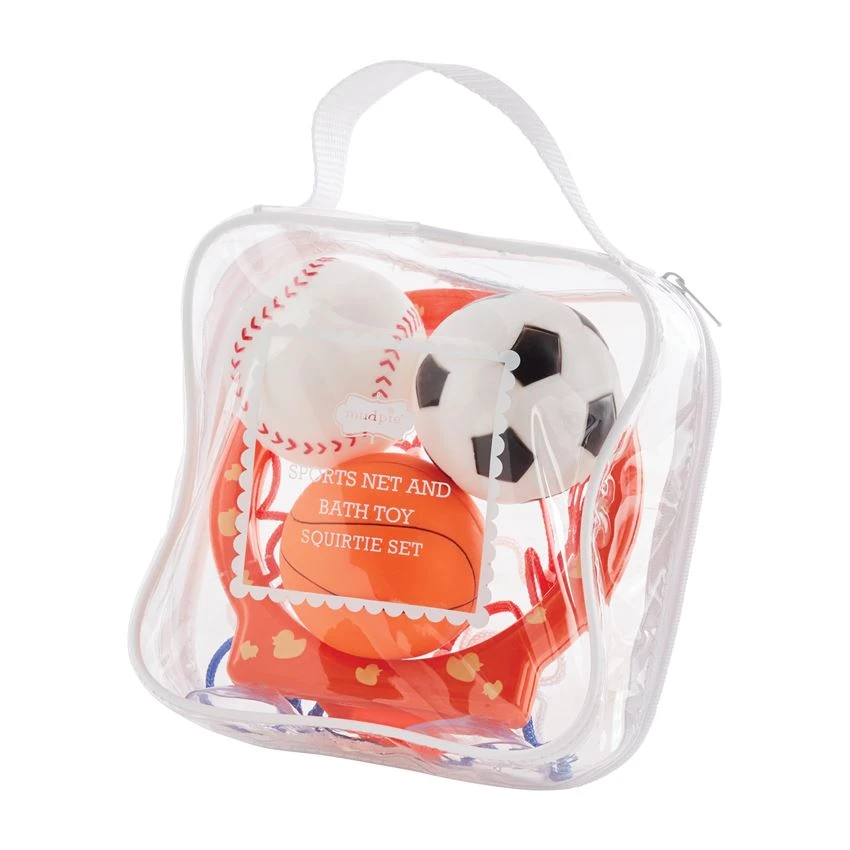 4-piece set. Rubber football, baseball and basketball bath toys arrive in vinyl zipper bag with basketball net. Net includes suction cups to adhere to sides of tub.