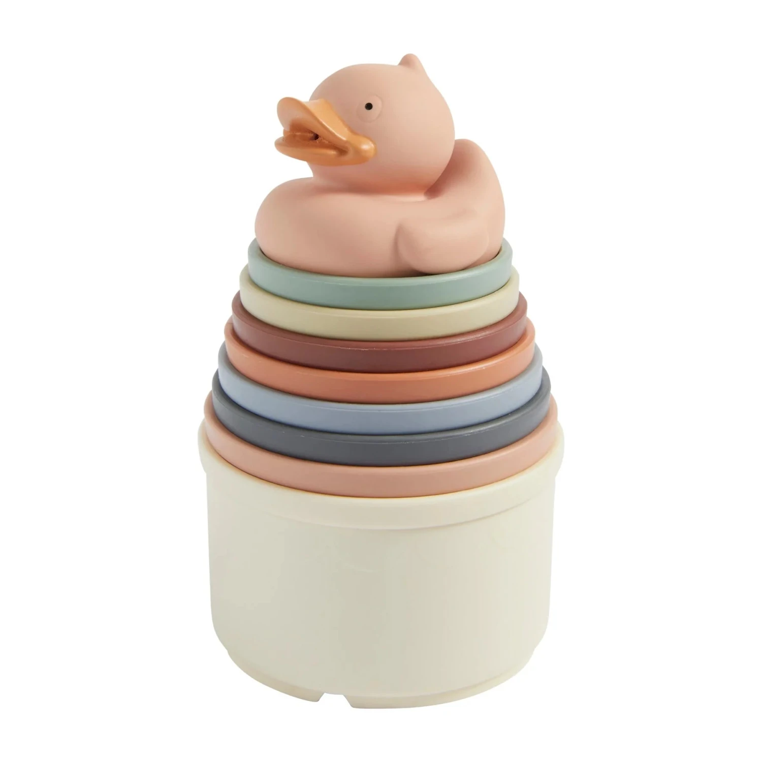 Keep your toddler occupied with this pink stacking cups sets. The 9 piece set comes with eight plastic stacking cups of various color including blues, greens, oranges and more! The stacking cup set comes in a mesh net, making it easy for gifting. The bag is topped with a pink rubber ducky.