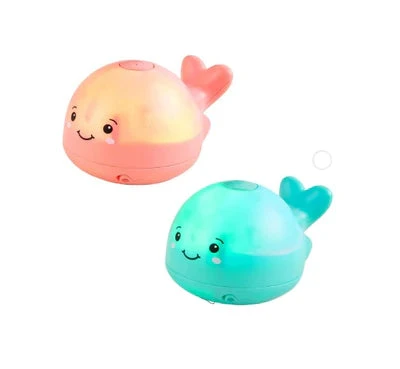 Whale bath toy sprays water from spout and lights up instantly when placed in water. Ages 18M+.