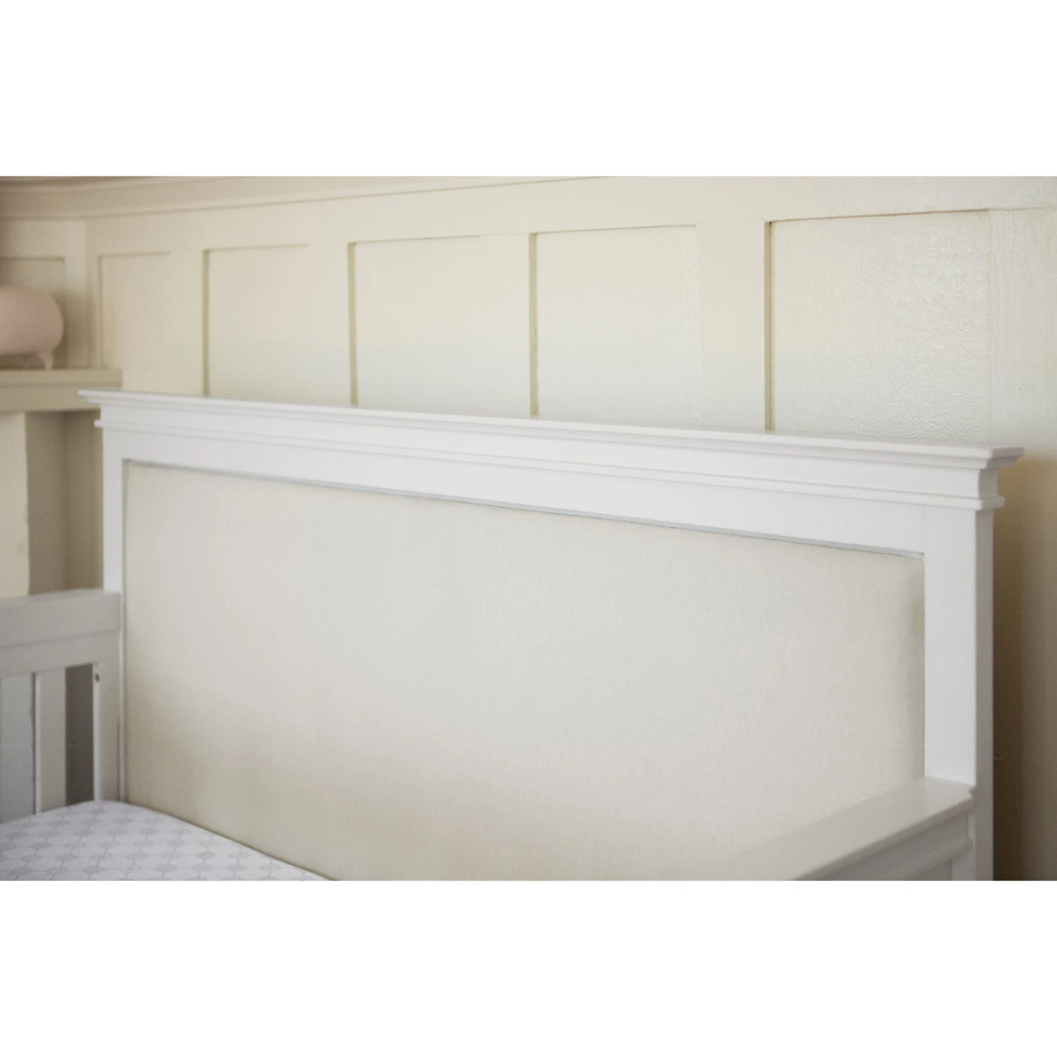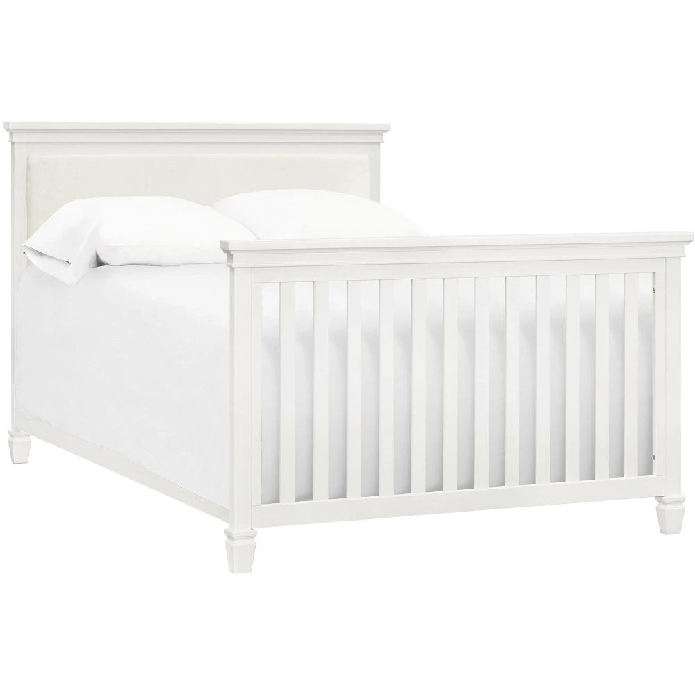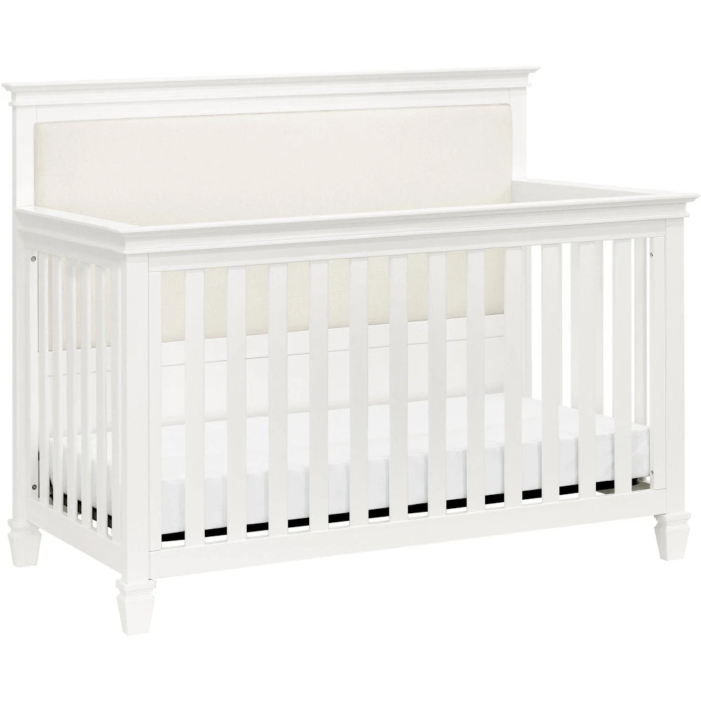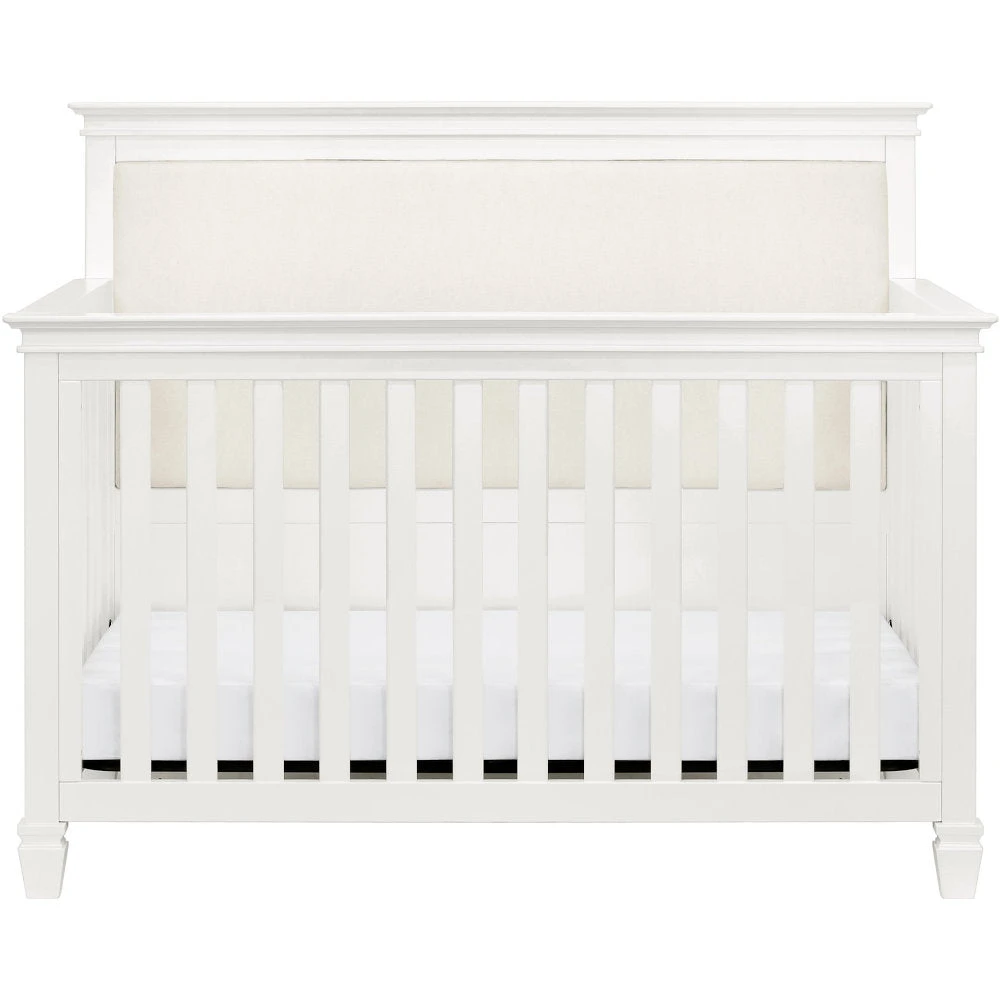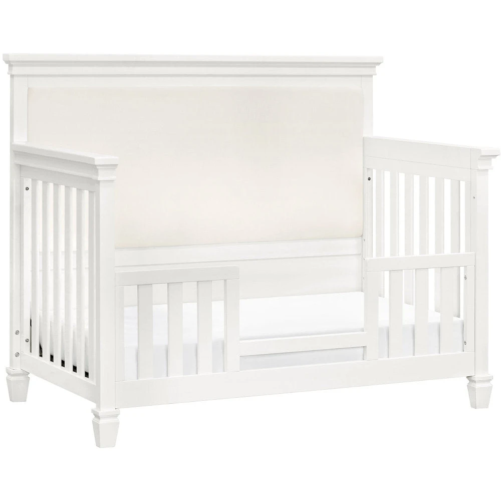 The Darlington 4-in-1 Crib brings the sophistication of relaxed French country style into the nursery. The Darlington balances delicate lines, gently detail molded tapered feet, and a lush upholstered back panel. Crib converts to a toddler bed, daybed, and full-size bed.