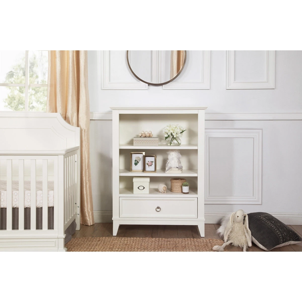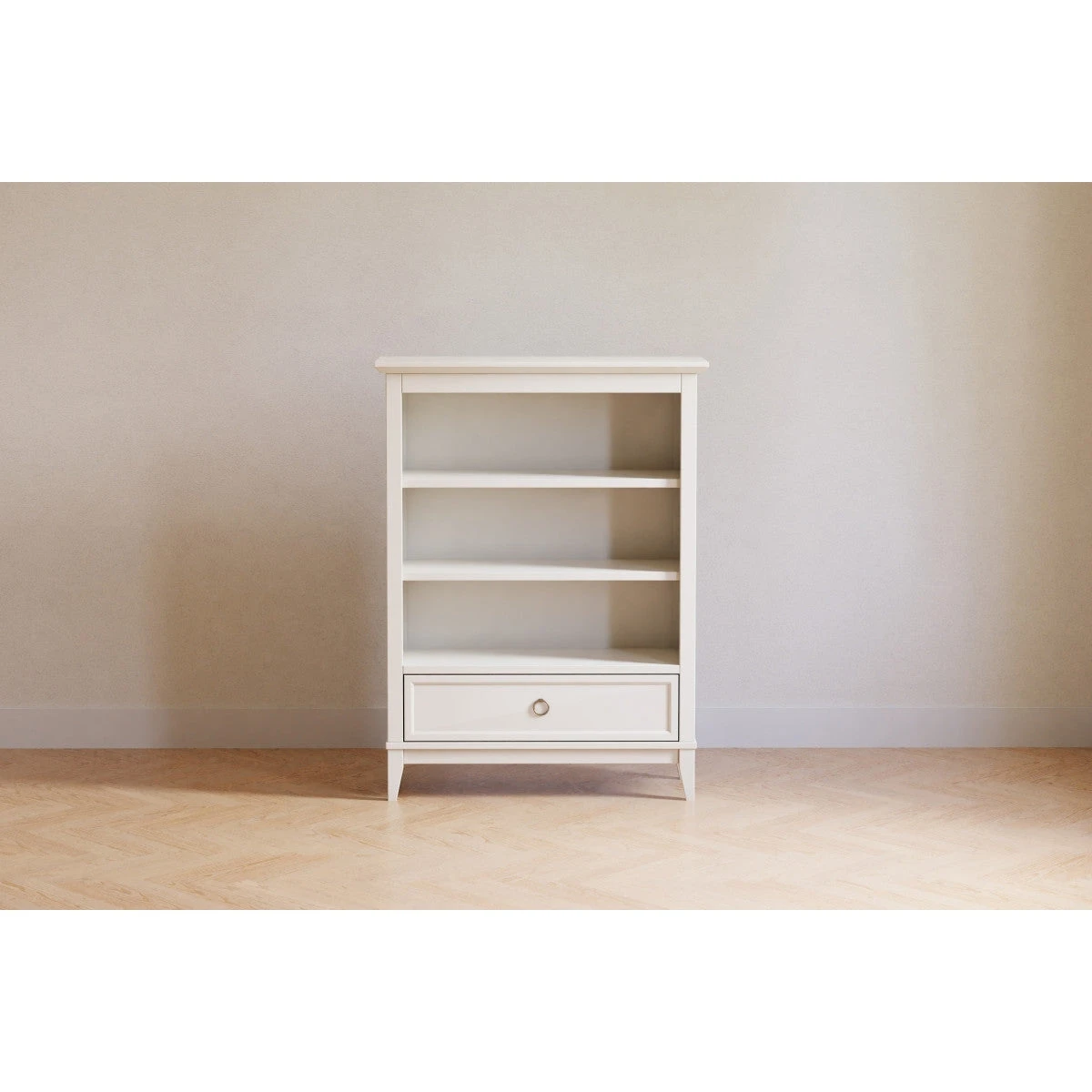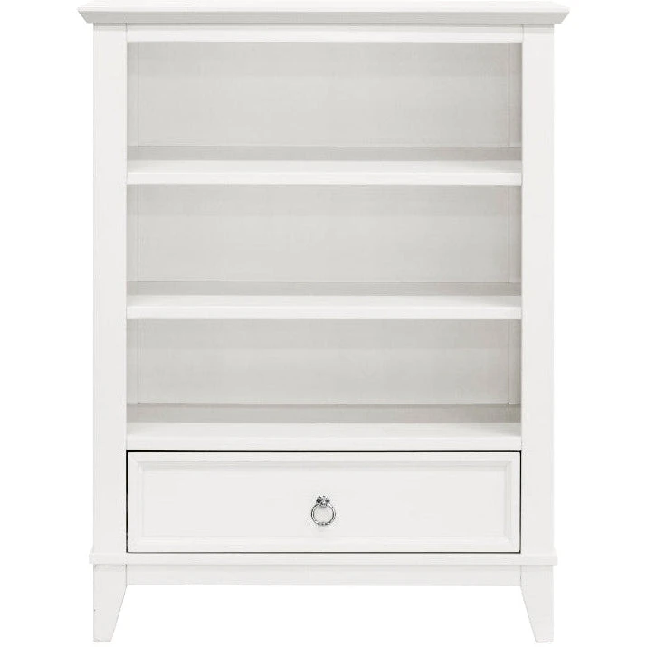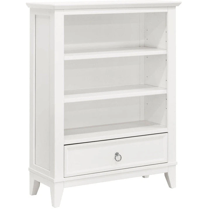 The elegant Emma Regency Bookcase provides generous three-level open storage for organizing and displaying your favorite treasures. Two adjustable shelves are available for styling preference, and a spacious closed drawer is available for additional storage within easy reach. With its sleek tapered feet, timeless front and side panel molding, and a ring drawer pull accent, the Emma Regency is the perfect piece to complete your classic Emma Regency Collection. Drawer features dovetail construction with full-extension and ball-bearing drawer glides.
