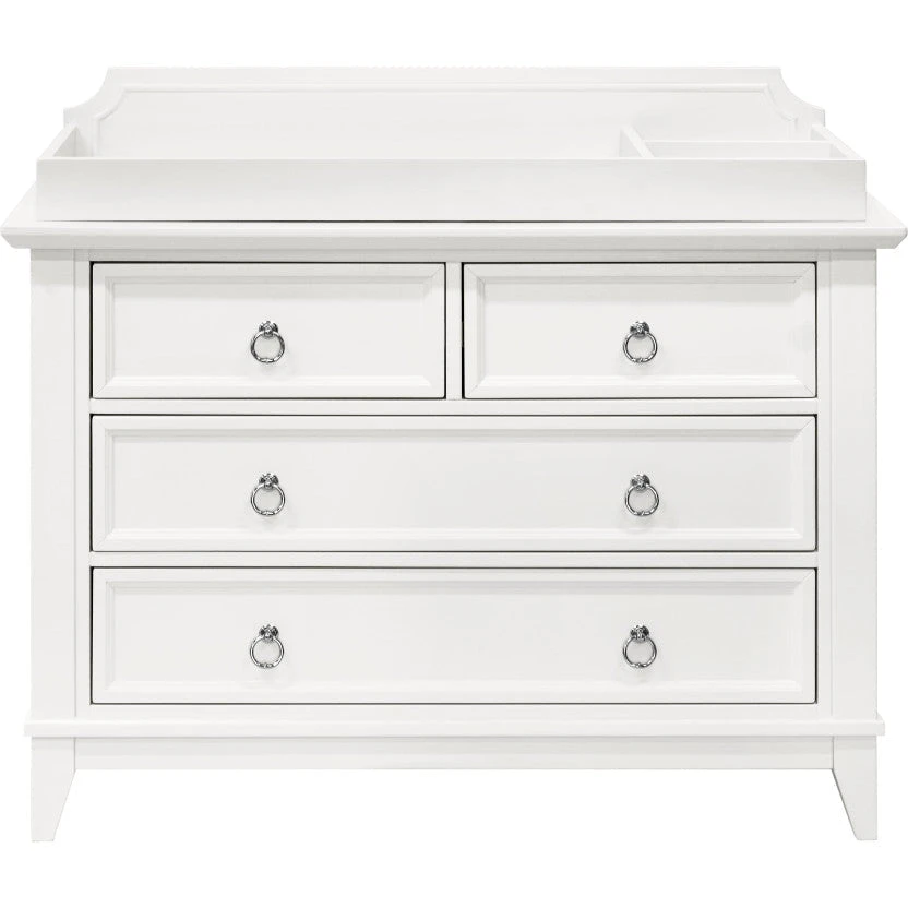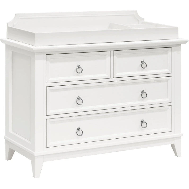 The Emma Regency Removable Changing Tray is the perfect functional accompaniment to the Emma Regency 4-Drawer Dresser. Featuring three compartments with a bold geometric styled back panel, this changing tray is the stylish accessory to seamlessly convert your baby’s dresser into a changing station that keeps all necessities at hand. The changing tray securely affixes to your Million Dollar Baby Classic double-wide dresser with safety brackets that are concealed in the back of the dresser. Once you are out of the diaper-changing stage, the tray can be easily removed to allow your dresser to grow with your child.