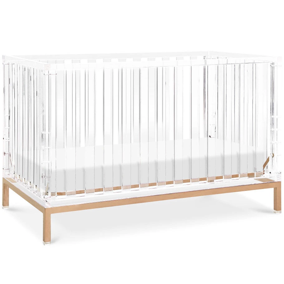 The Luma Crib seamlessly integrates form and function in the nursery space. The crib marries our signature acrylic aesthetic with an au courant rose gold touch. With four clear sides perforated by defined slats, the Luma creates an airy space for baby to play, relax and sleep, and allows you to have a clear view of baby from anywhere in the nursery.