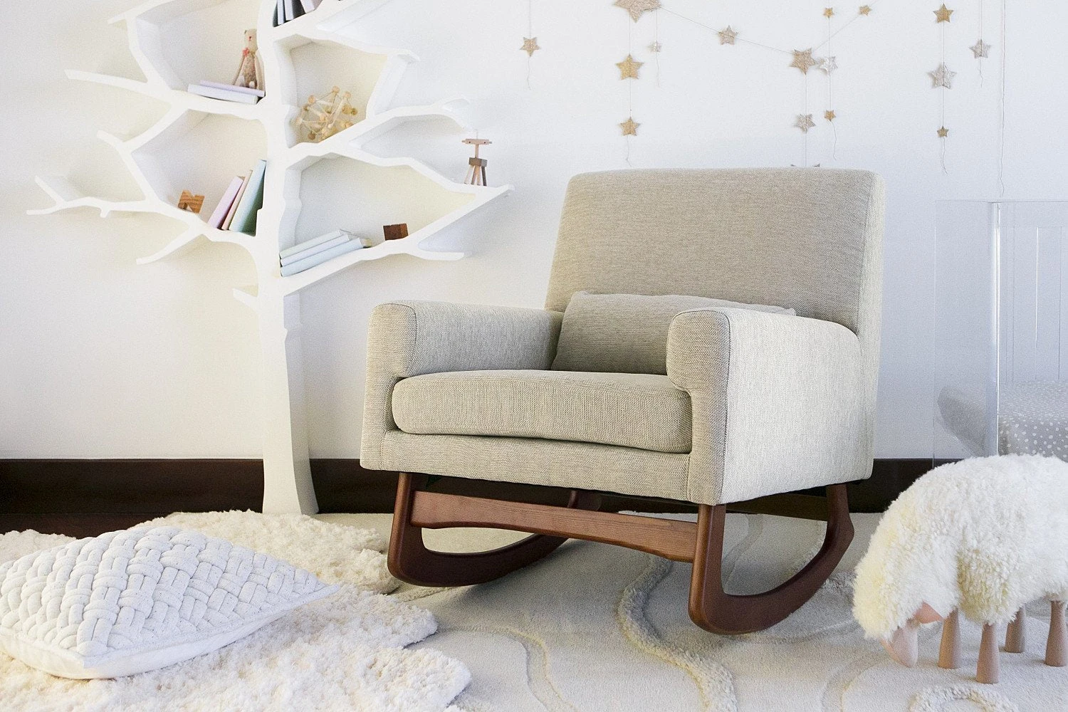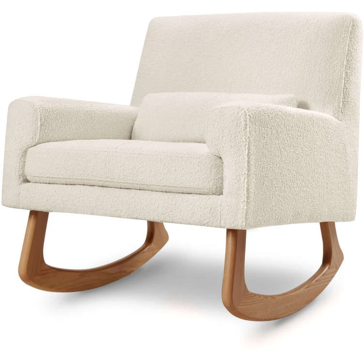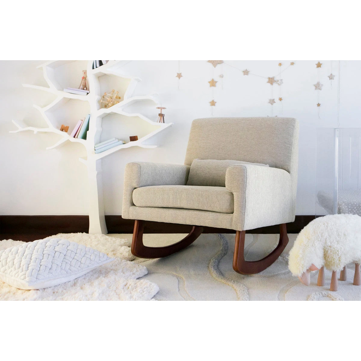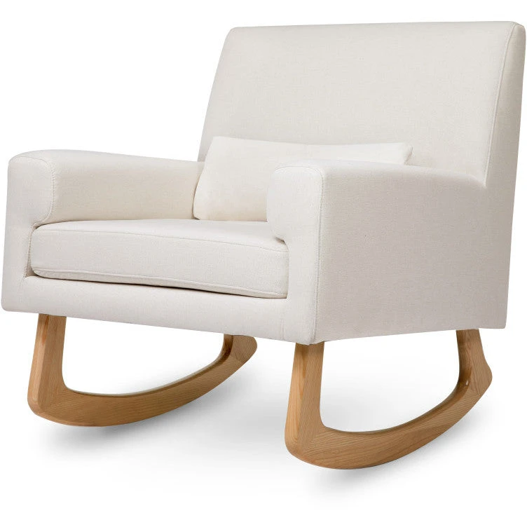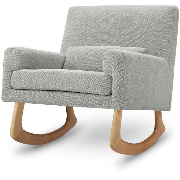 The well-balanced Sleepytime Rocker is lightly padded and finely upholstered with a fitted back using a crisp and rich polyester, linen and viscose blend. Ash hardwood legs allow for a smooth rocking motion.