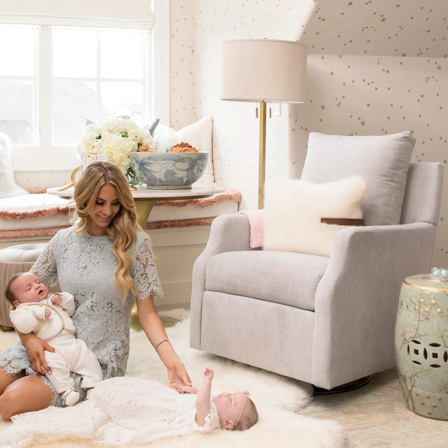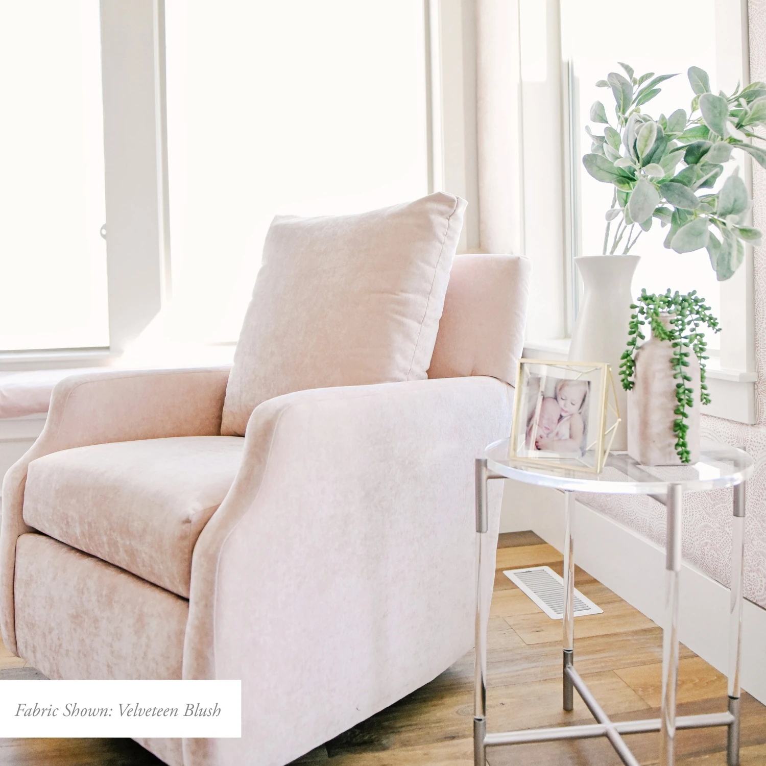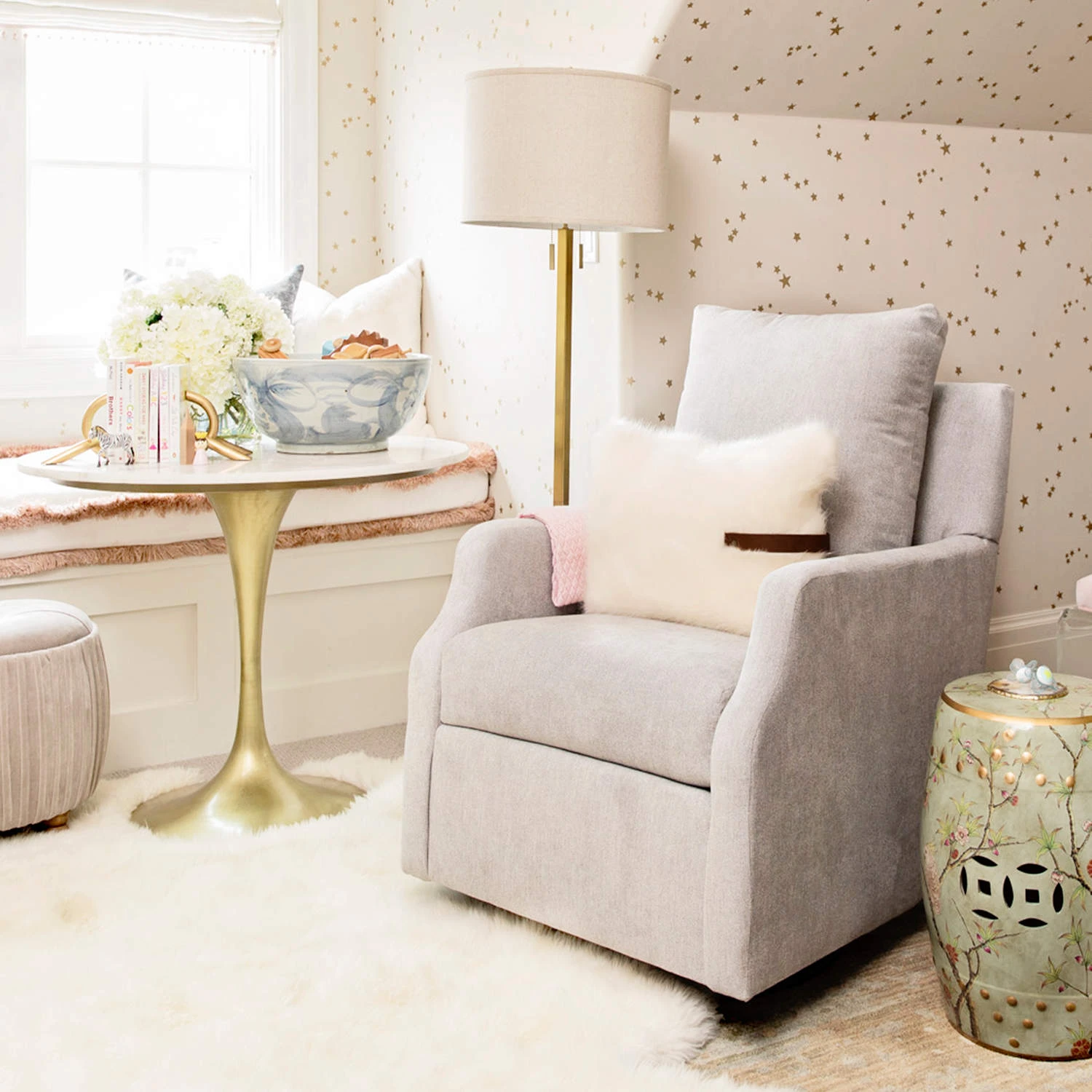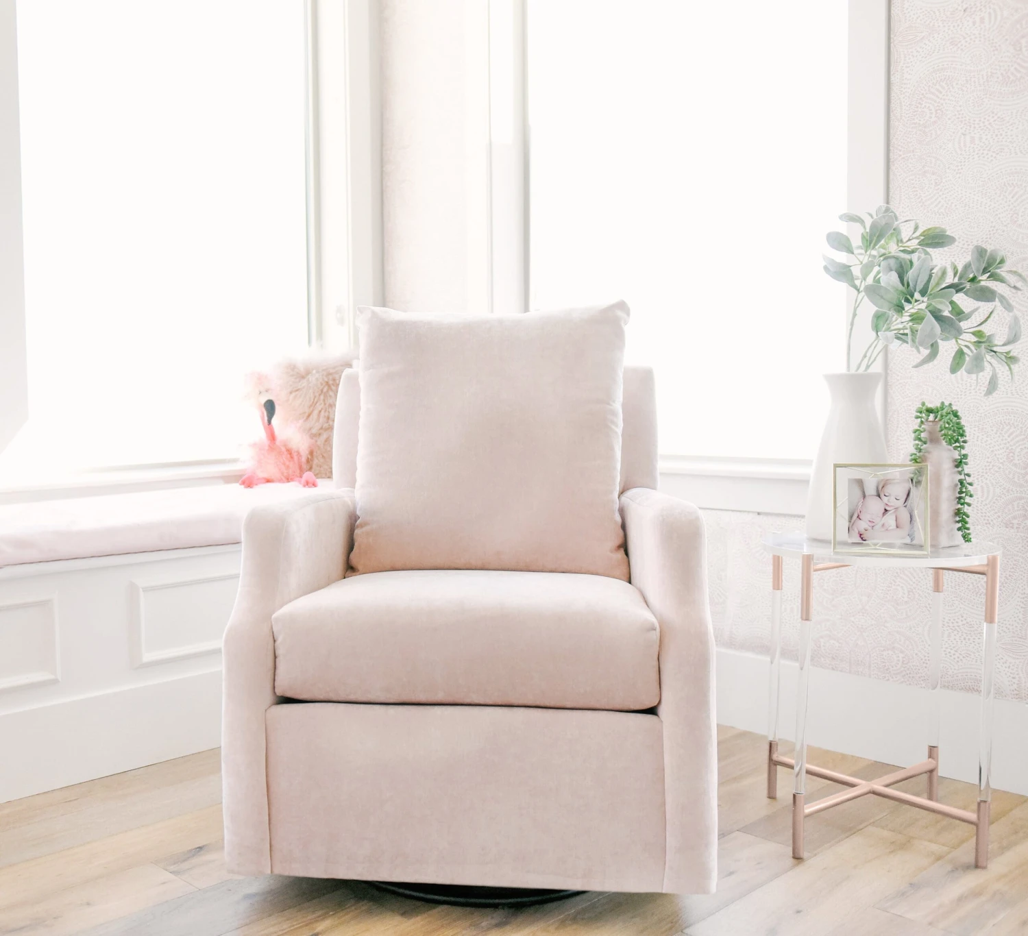 Our exclusive Harper gliding swivel Nursery Recliner does everything: it reclines, rotates, plus it has a parallel rocking motion that gently glides, so you easily turn toward anything you might need to reach.