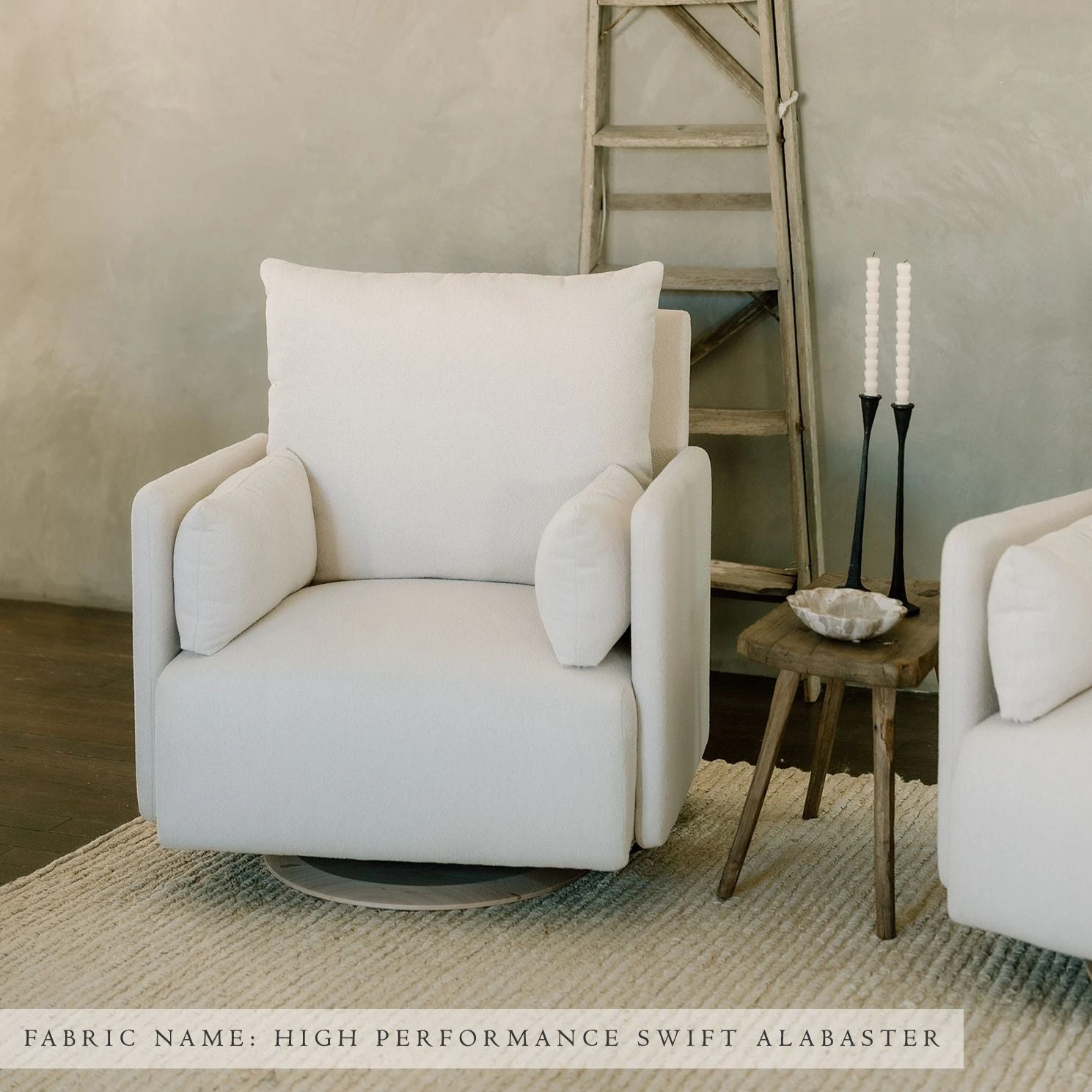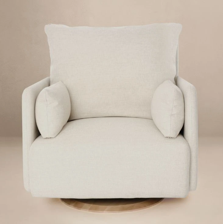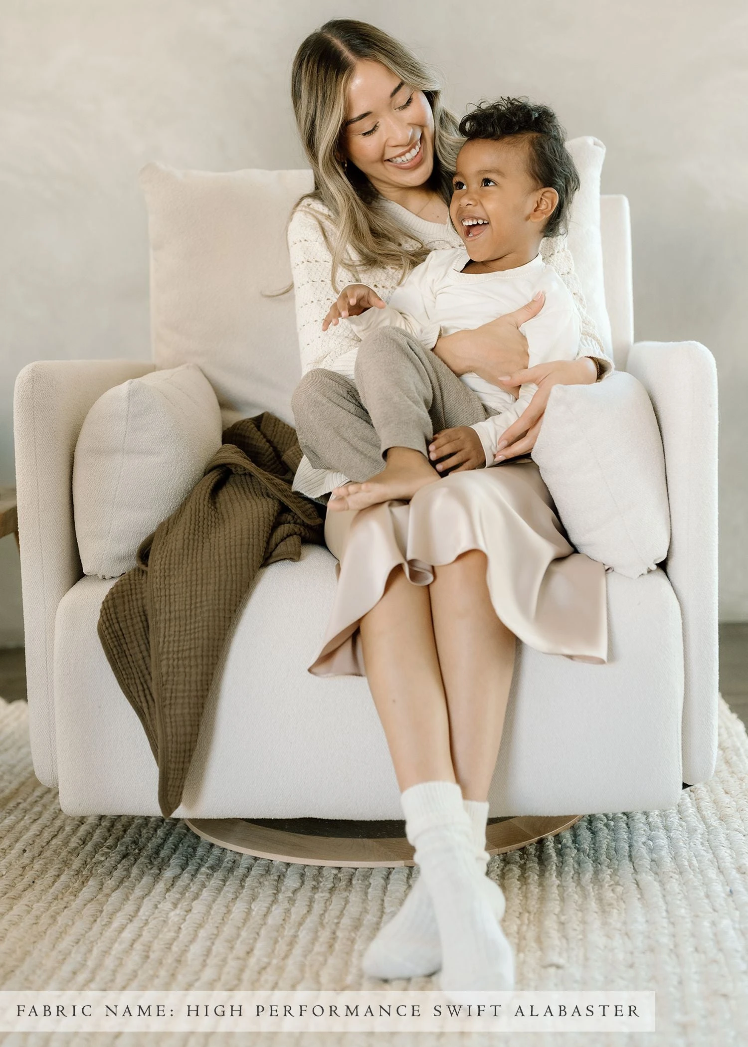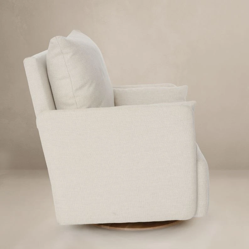 Introducing our exclusive Milo Swivel Nursery Glider—a versatile chair that combines a full 360º swivel with a gentle gliding motion for ultimate convenience. Boasting an extra-wide seat, removable side pillows, and an adjustable back pillow height, this chair & a half is perfect for twins or including toddlers & babies in on snuggle time.