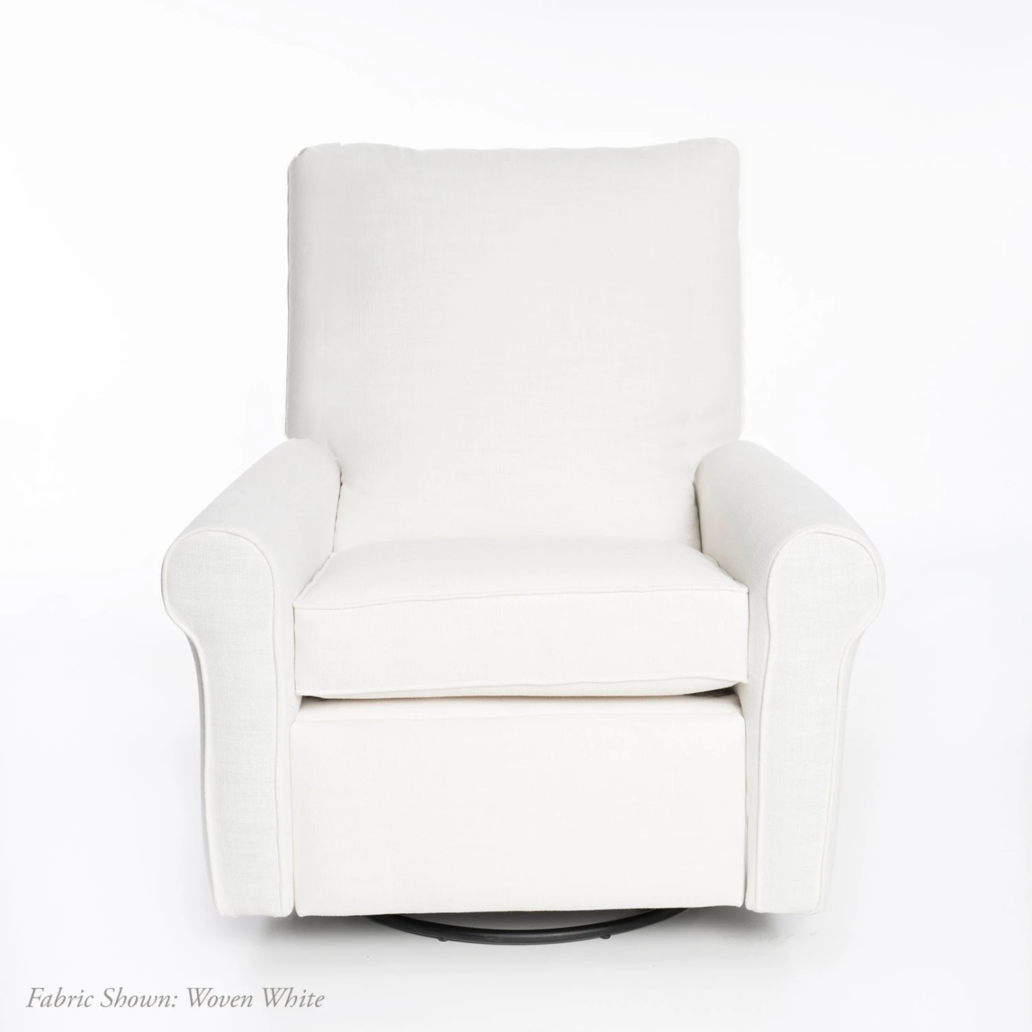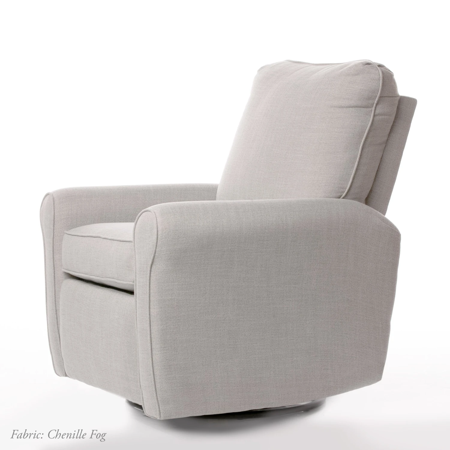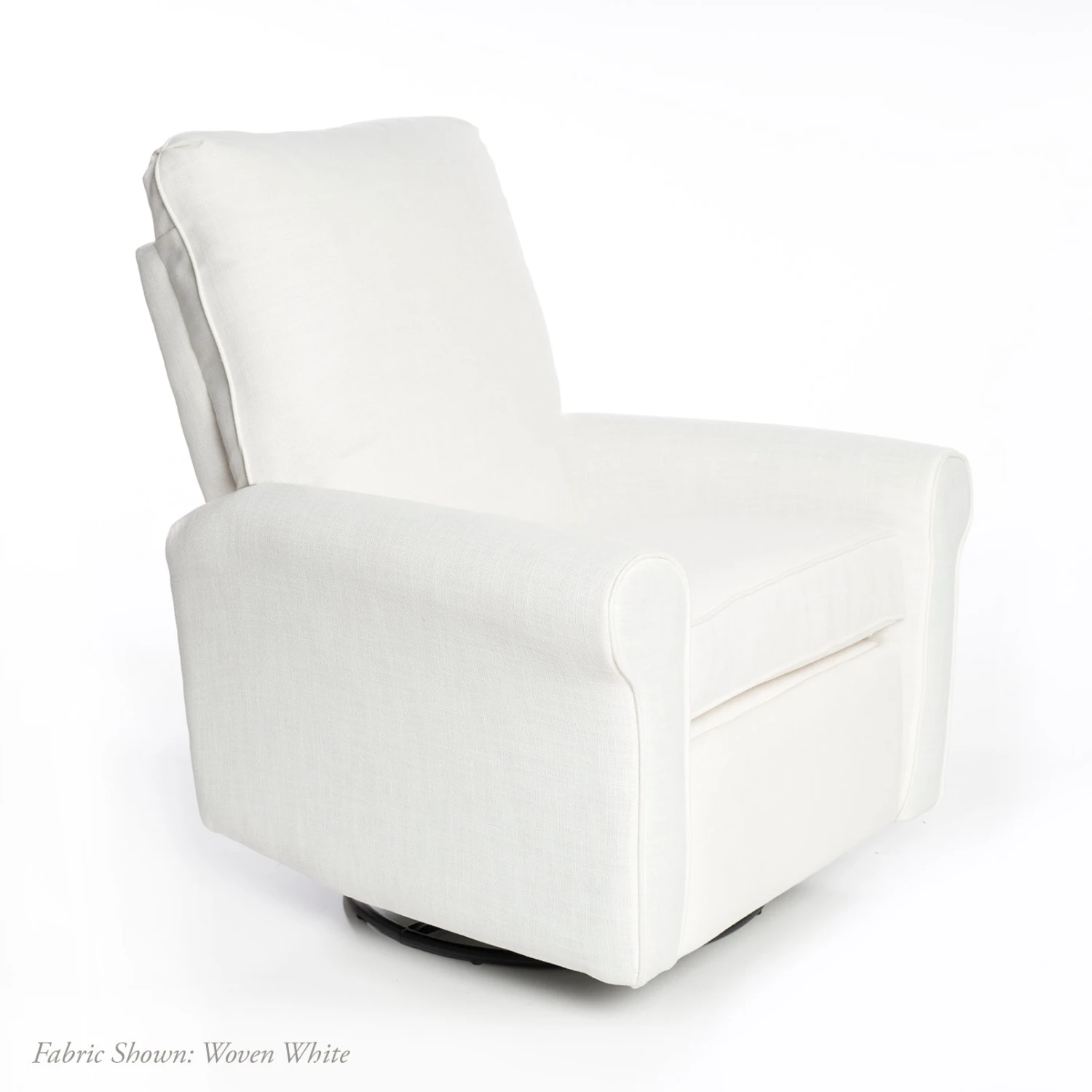 Our exclusive Orly gliding swivel Nursery Recliner does everything: it reclines, rotates, plus it has a parallel rocking motion that gently glides, so you easily turn toward anything you might need to reach.