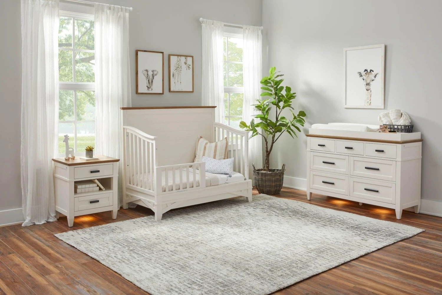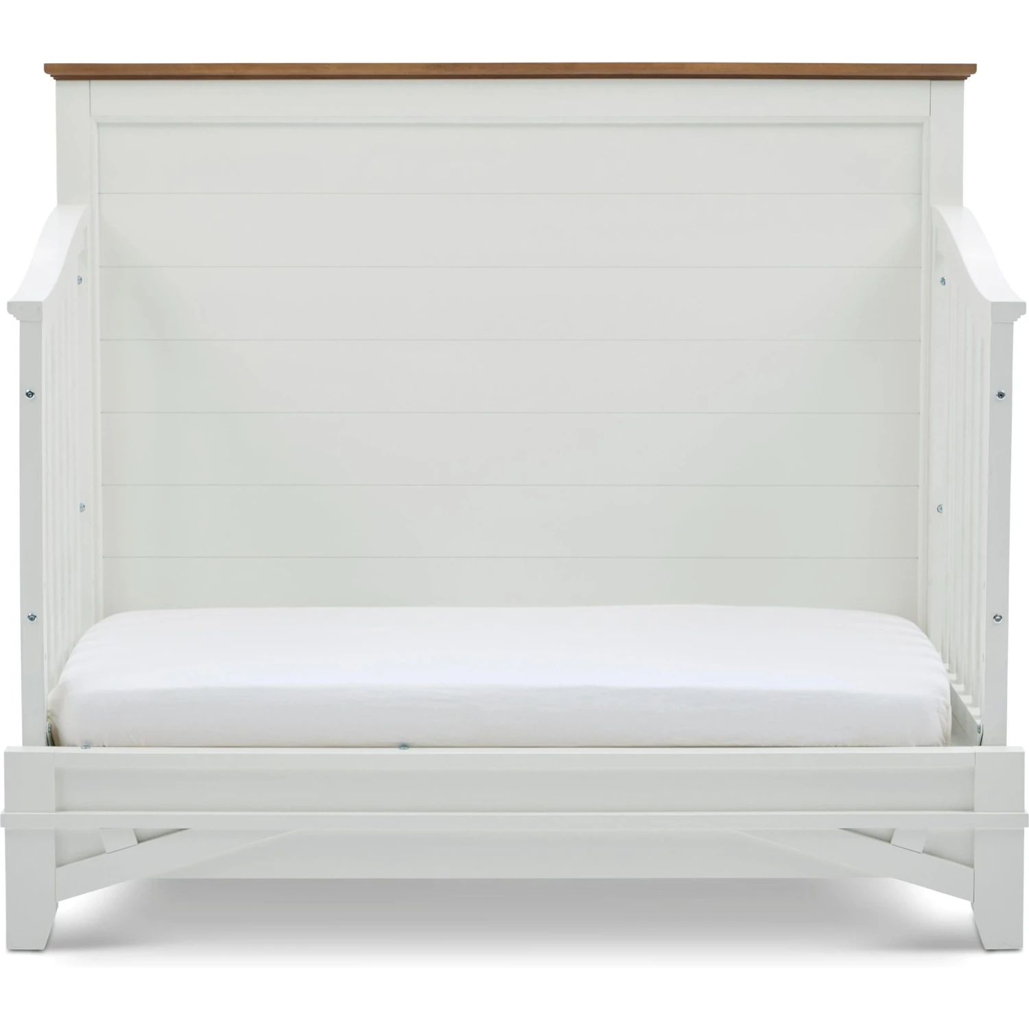 The heart of your nursery, the Artisan Convertible Crib combines clean lines with a farmhouse-inspired silhouette. Its elevated design includes a linen white finish with a warm oak cap rail, crafted from solid poplar hardwood for long-lasting durability. As your baby grows, this 4-in-1 crib effortlessly converts into a toddler bed, daybed, and a stylish full-size platform bed using the available conversion kit.