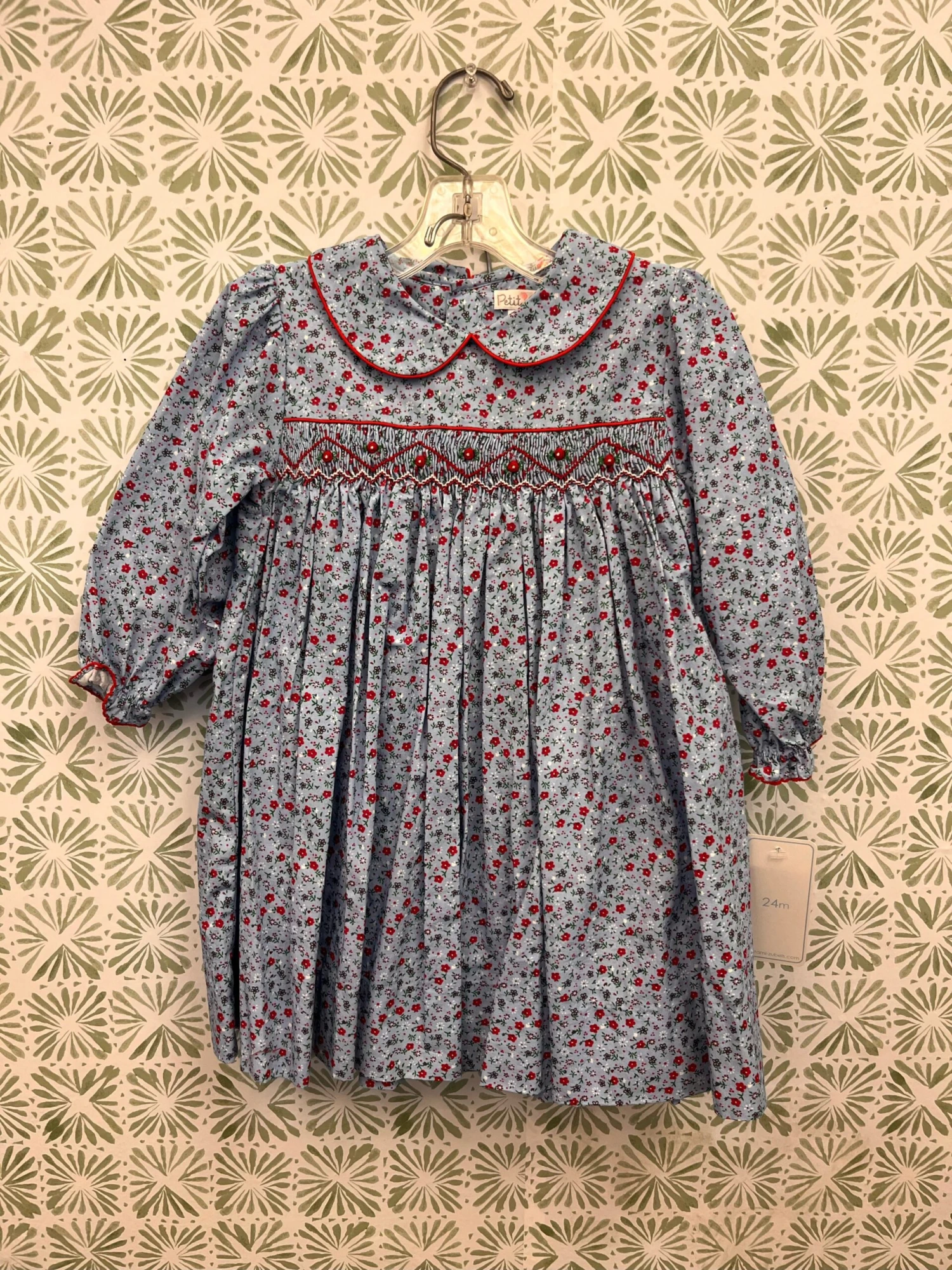 Long sleeve smock dress. Red and blue floral print. Matching Bloomers.