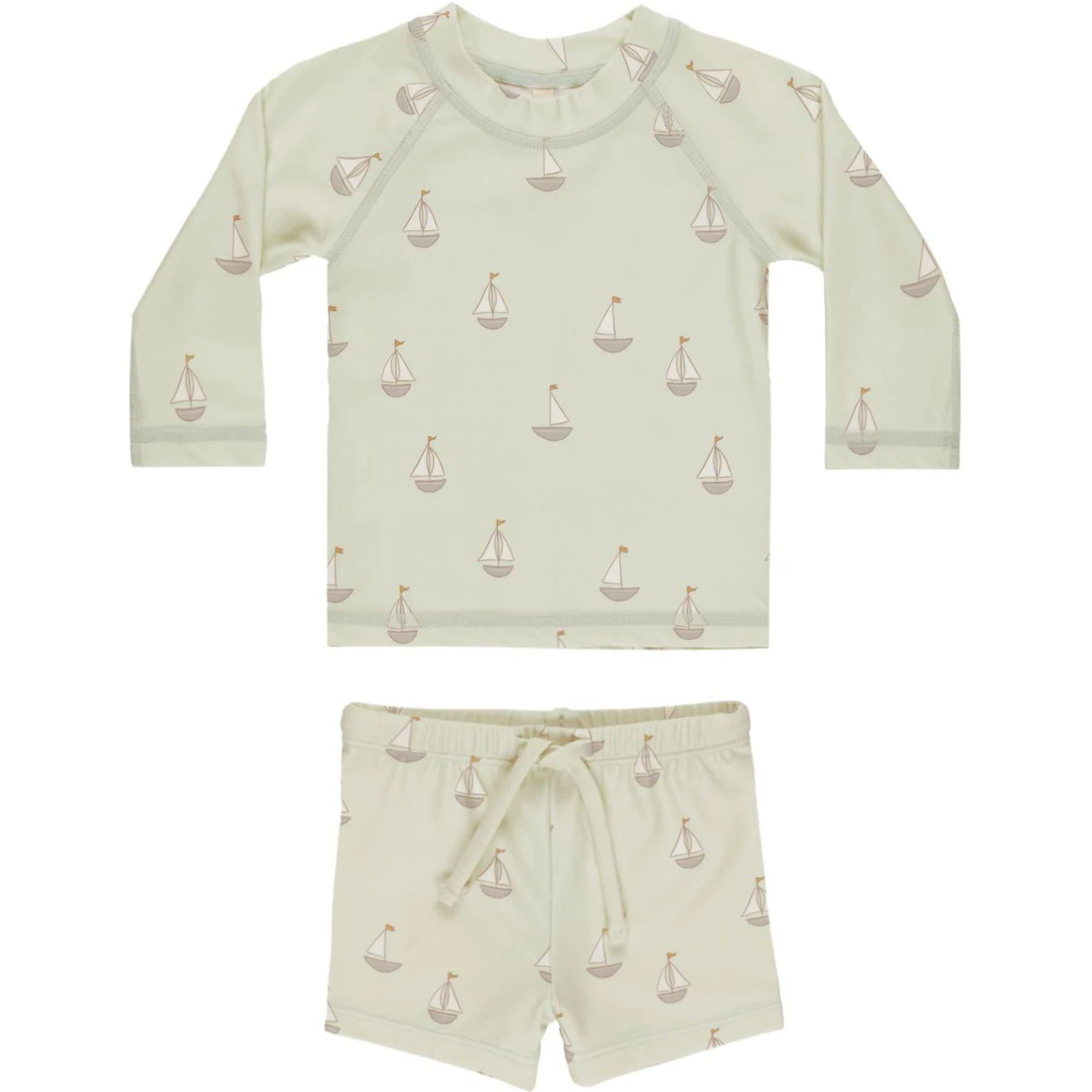 This two-piece rashguard set will keep your little one protected from the sun in style. Featuring a long sleeve rashguard top and coordinating boy short.