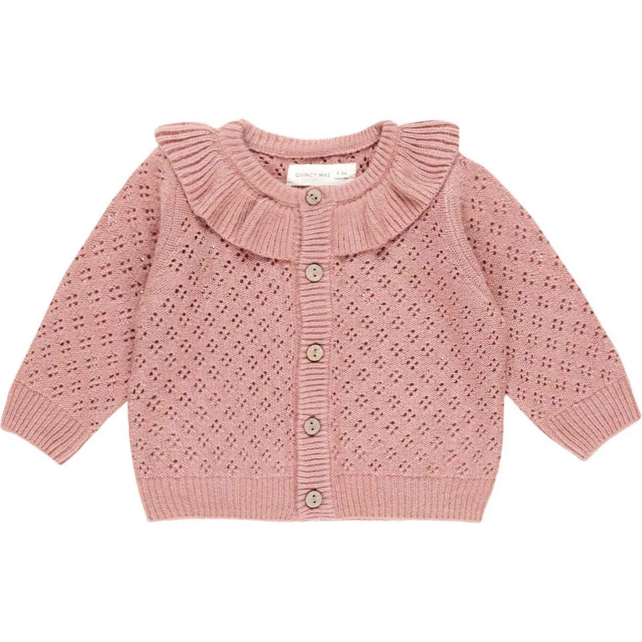 This sweet cardigan features a charming ruffle collar and light coconut summarys. Made from our beautiful organic pointelle sweater knit.