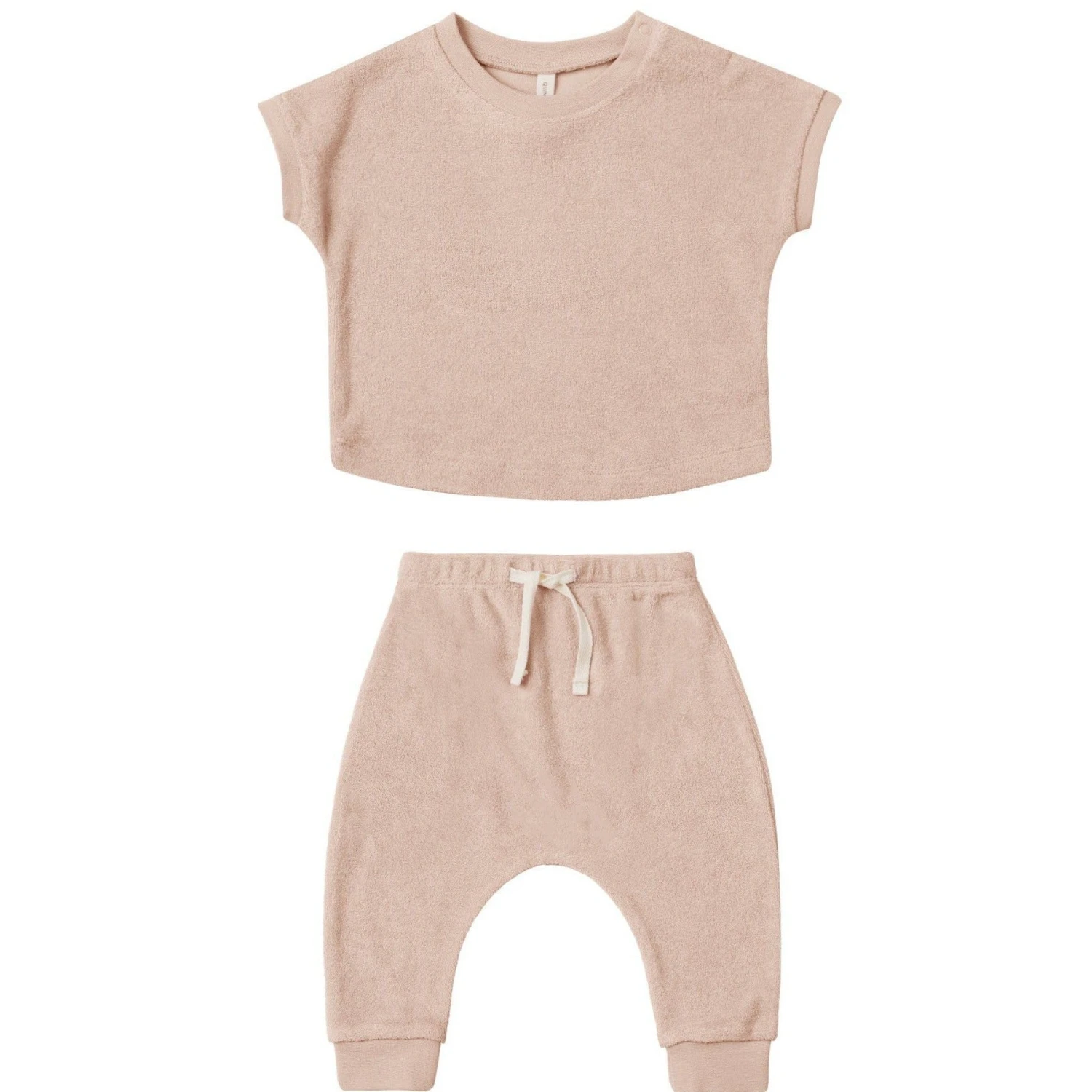 Our Terry Tee + Pant Set includes our boxy fit tee and comfy sweatpants with an elastic waistband and adjustable drawstring.