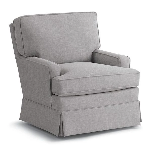This nursery swivel glider has a transitional look with its squared back and square arms. It is accented with contrast cording around the arms, seat cushion, semi-attached back and tall dressmaker skirt. This unit is also available with a matching glide ottoman. Also available without contrast cording.