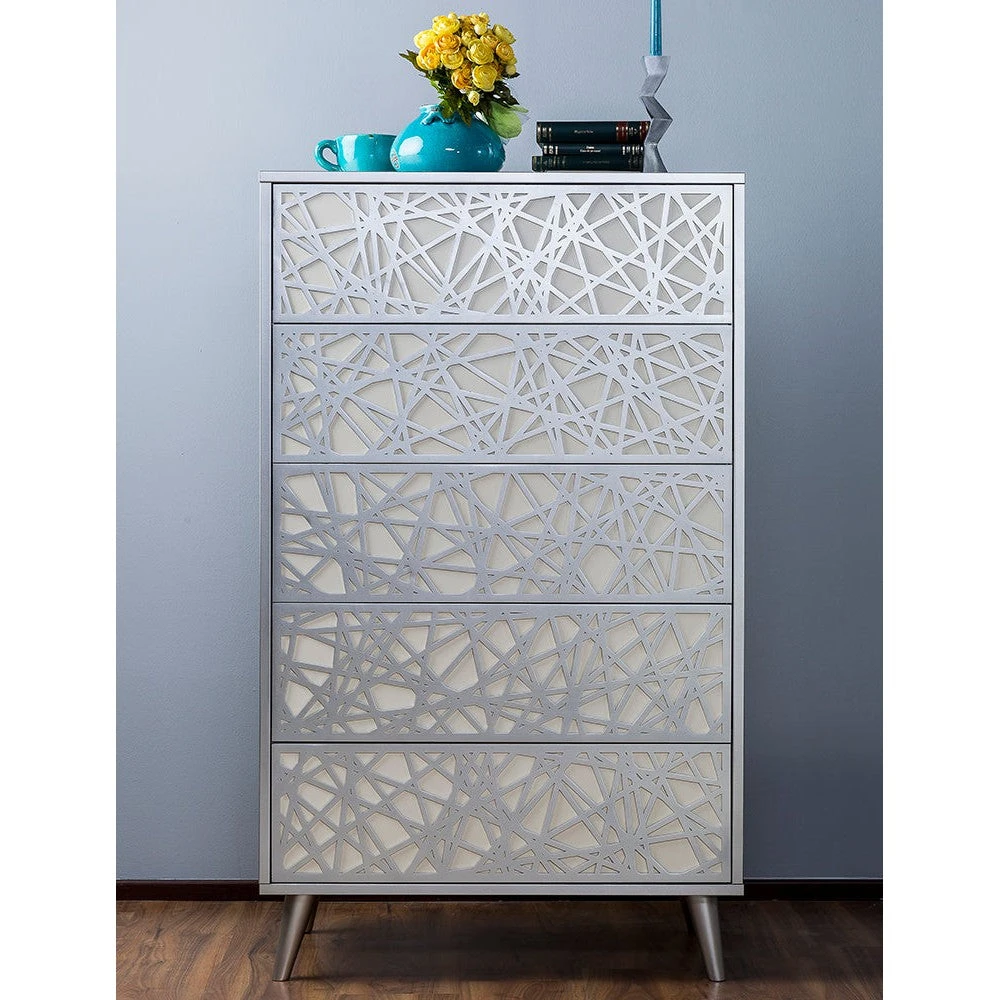 New York single dresser is a space saver and style maximizing instrument. Equipped with five large drawers, it can keep those small rooms neat and comfortable. This dresser is available in standard and two-tone finish but it can also be upgraded with Eco-Leather Inlay in Silver or Copper.