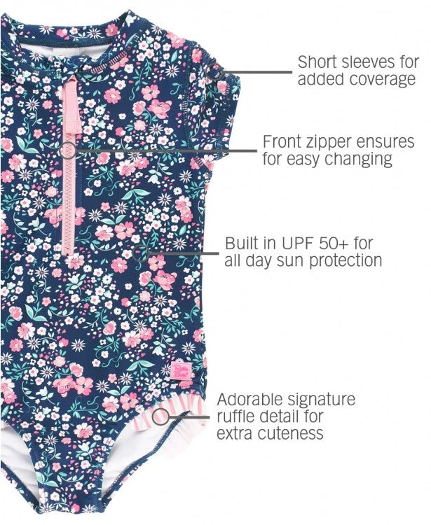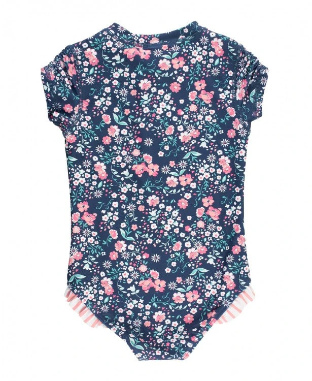 RuffleButts Girls Moonlit Meadow Short Sleeve One Piece Rash Guard
