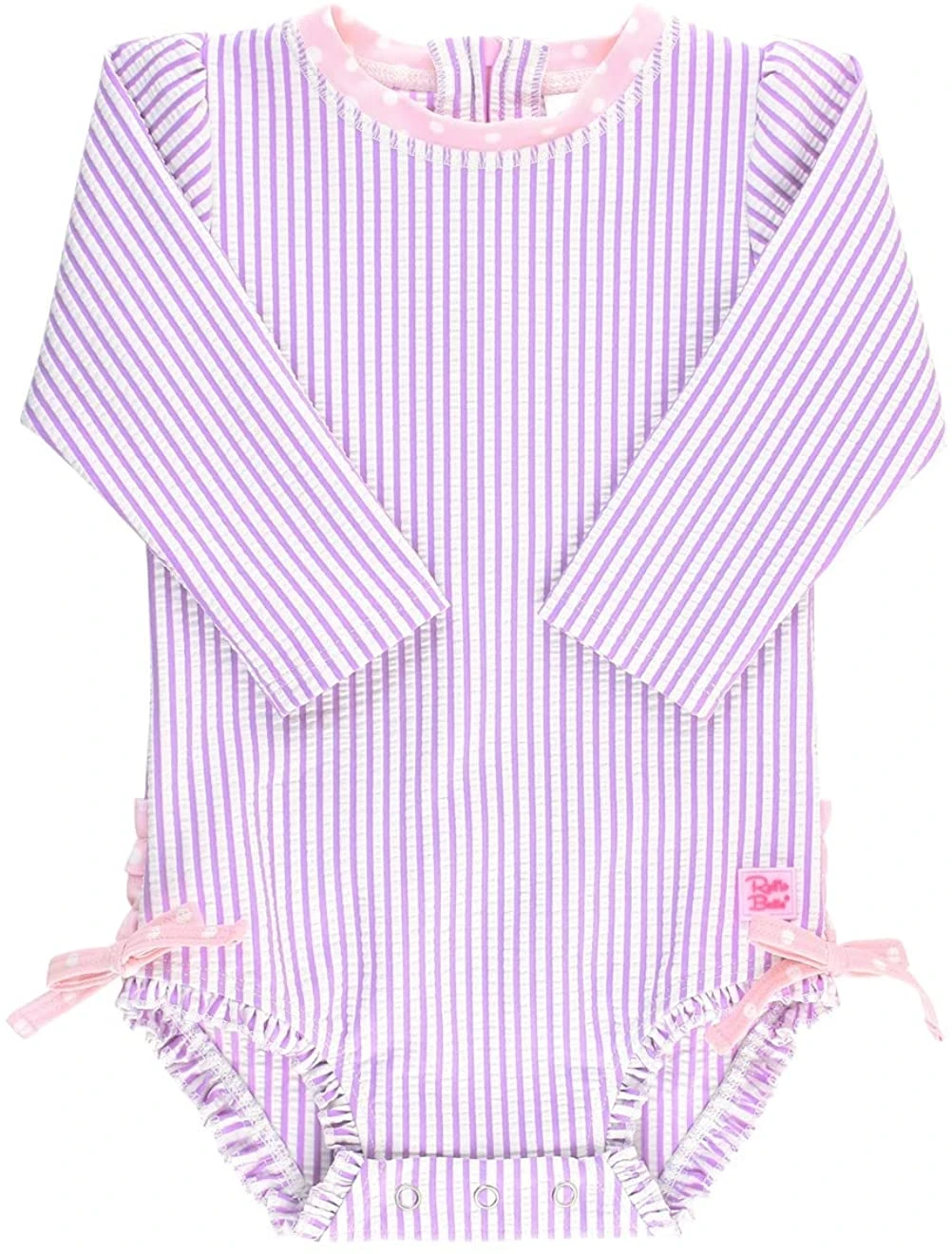 Be sure your little one is ready for the beach, pool or lake in this adorable lilac seersucker swimsuit. The sweet and classic seersucker UPF 50+ sun-protective fabric and long sleeves will keep her safe from the sun’s harmful rays on full days of play. Add her monogram and pair with a coordinating wide brim swim hat for a complete look.