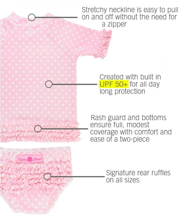 Make a splash in this precious two-piece pink polka dot bikini for girls. Created with built in UPF 50+ sun protection, this suit is a must-have for your little girl’s swim wardrobe. Whether she’s headed to the beach or swim lessons, you can be sure she’ll love this comfy baby girl rash guard swimwear set!