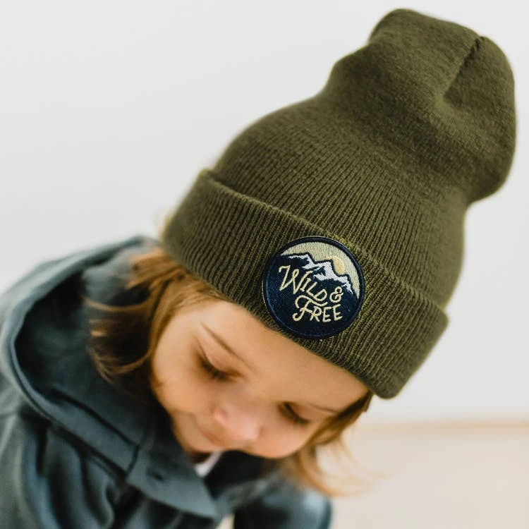 Knit kids beanie with embroidered patch. Soft and stretch fit. 1-5 years old, one size fits most. Hand wash cool water/turn beanie inside out for washing/dry flat. Made in the USA. Material: Acrylic. Color: Moss