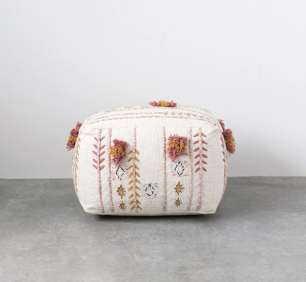 Square Cotton Embroidered Pouf W/ Applique & Fringe, Cream Color