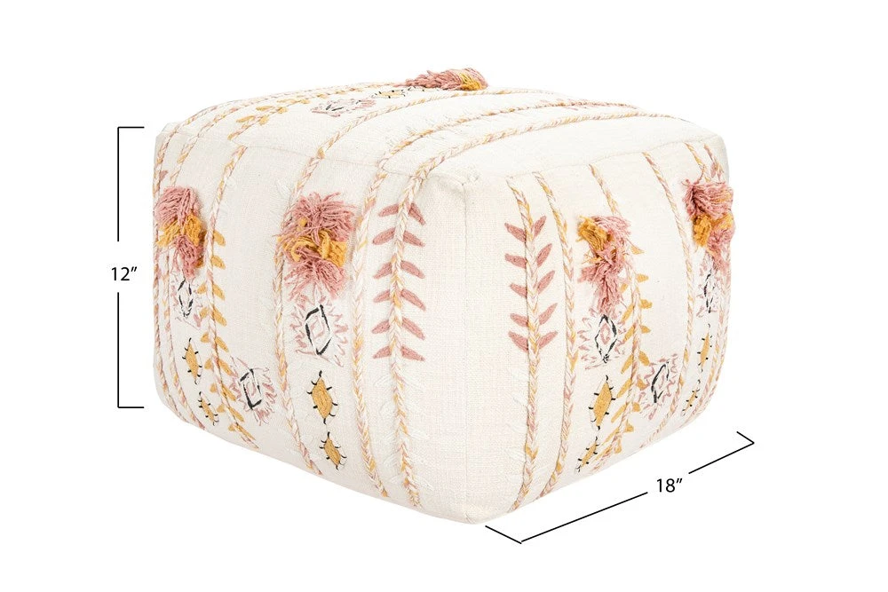 18″ Square Cotton Embroidered Pouf w/ Applique & Fringe, Cream Color