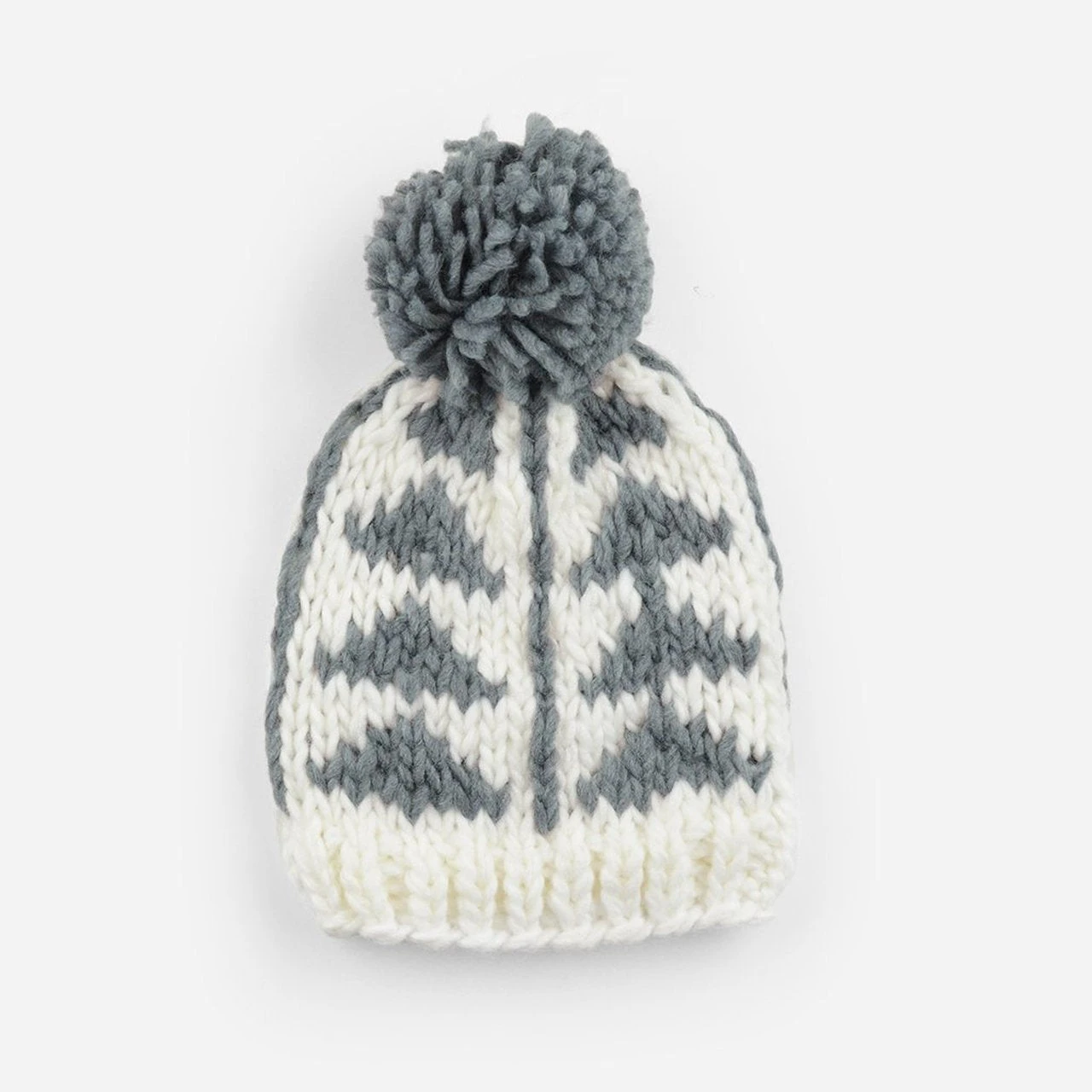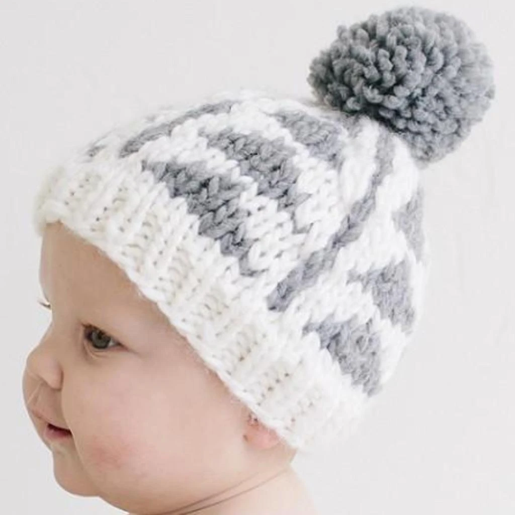 This hat is cream with a light gray geometric pattern that is perfect for complementing any outfit. The gray pom on top completes the look, and the soft and stretchy design means the kids will want to wear this hat all day.