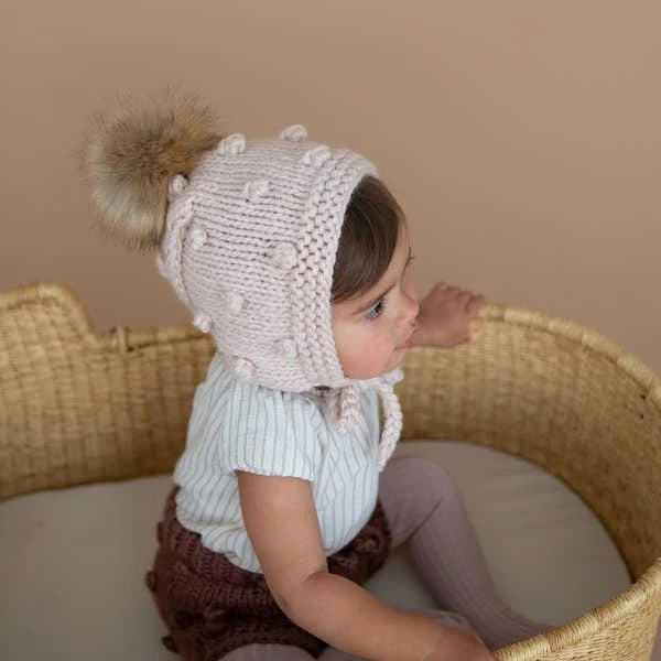 Our Coco Bonnet with pom is a classic design with all-over popcorn bobbles.