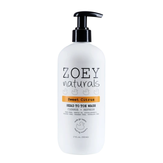 Our Sweet Citrus Head to Toe Wash is free of harsh chemicals and gently cleanses skin and hair. It’s naturally gentle, tear free and has a gentle pH. Zoey Naturals is formulated for babies and loved by mamas all around the world!